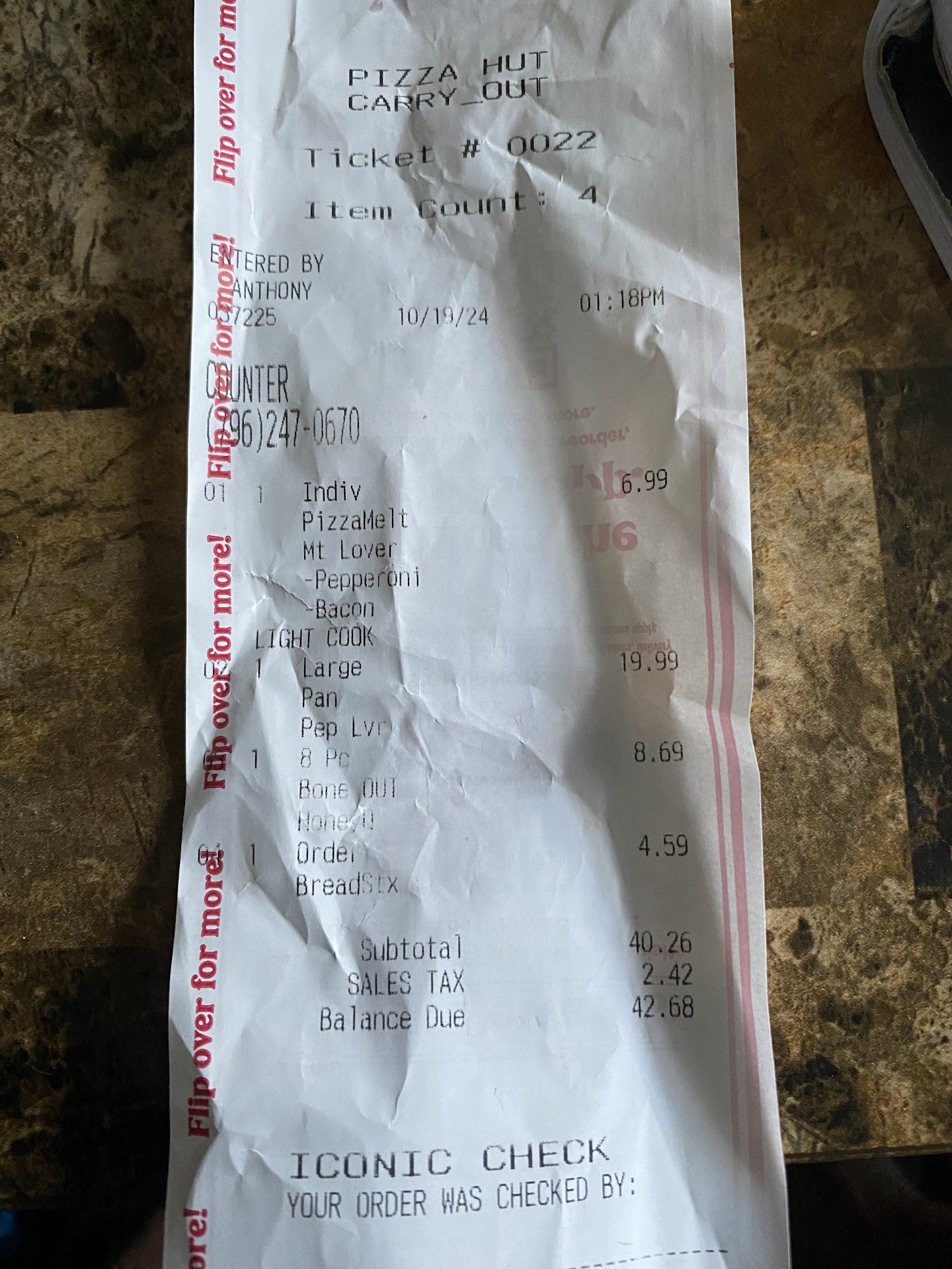 Positives: Service was great, Alyssa kept right up with our crazy family. As for the food, let me start off with saying it was the best we have ever had at this particular Pizza Hut. Delivery always comes great, but normally when dining in the bread (any of them) is table hard... But this time I asked for the bread to be cooked a little less and they did great! The pizzas we're actually was fresh and perfect... Normally I wonder why everything tastes day old. I will always ask for it all to be cooked to where it is soft. Who would want hard food anyways?