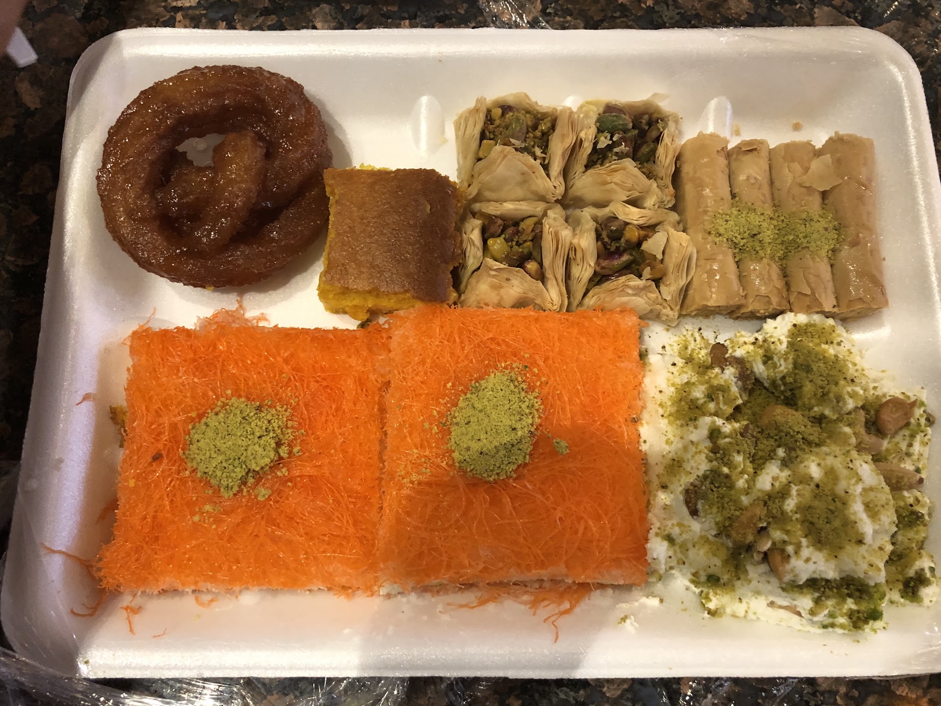 Read moreYou would feel amazed to be here, if you have a sweet tooth like me. A middle eastern sweet shop to offer thousands of various sweets, cakes and pastries and ice cream. To start with, let me tell the procedure. I arrived in the evening and it was very crowded. So you have to collect a token and wait until your number is called. Then you go with the token and tell the server lady what you want. And then you pay. We got a trouble. Being outsider ( non middle eastern I mean), I did not know the name for everything. So we had trouble to tell them what we want ( not to mention the accent difference etc). It was busy hour and we wanted so many different stuffs. After struggling a while, we managed to plate them all. Next, we heard that they were taking only cash ( because their system broke down or something happened I don’t know)!!! Luckily one of us had the cash to save the mission! We bought a lot of sweets ( check images) and the entire order was worth of 26$ only. Now, I was disheartened with the kanafeh. I have had much better elsewhere. This one was dry and not tasty. But rest of the things - Baklava, pistachio baklava, layered busbusa, Turkish delight, and another one ( dunno the name, appears like white foamy subtle flavoured cloud like, topped with nuts and nuts) were simply extraordinary. With so many varieties of sweets, if you feel to have something savoury, they have meat pie/cheese pie/ spinach pie to offer. We ate the meat pie which was the absolute yum. I forgot to buy some for my home. But this is a must visit if you love to eat desserts and sweets and...