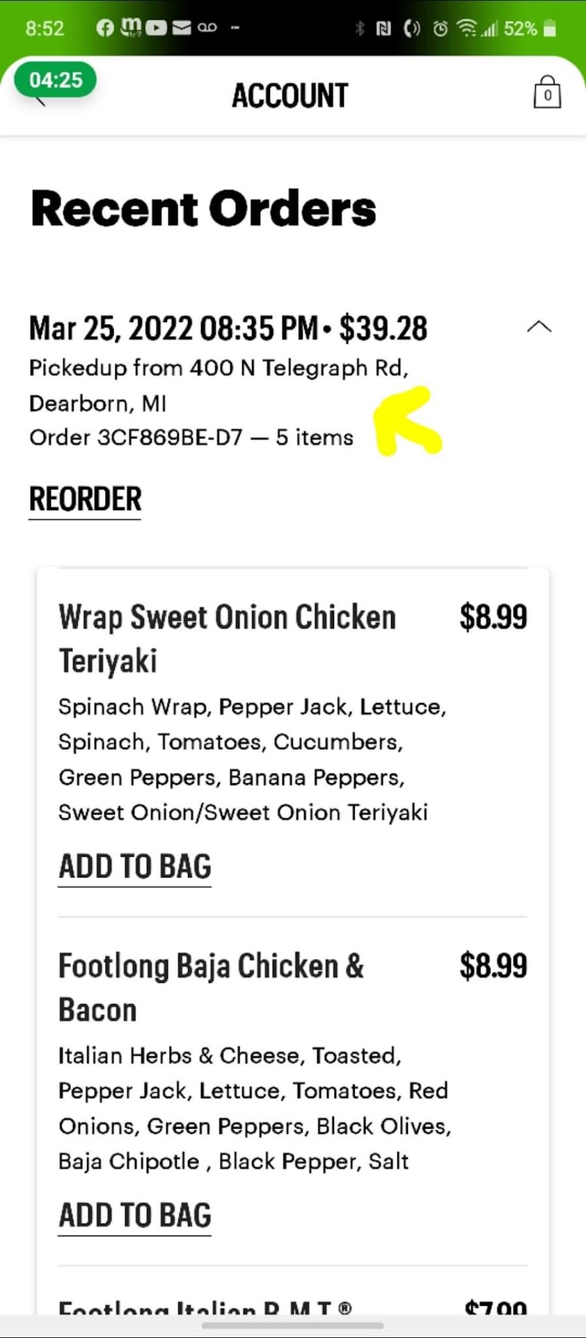 Ā Ā Ā Read moreAs it can be seen from the pictures, I requested that my 6 inch subs be cut in half. They ignored this request. This is the 2nd Subway to do this, but the first time I'm leaving a review about it. Also, when I place an order online, I expect to walk in, grab my complete order, and walk out. I do not expect to grab my sandwiches from a shelf, walk over to another shelf to grab my chips, then walk over to the fountain drink machine to make my own drink before leaving the store. I would have taken another star for the condition of the restroom, but this Meatball Marinara sub is so good, I'll just leave...