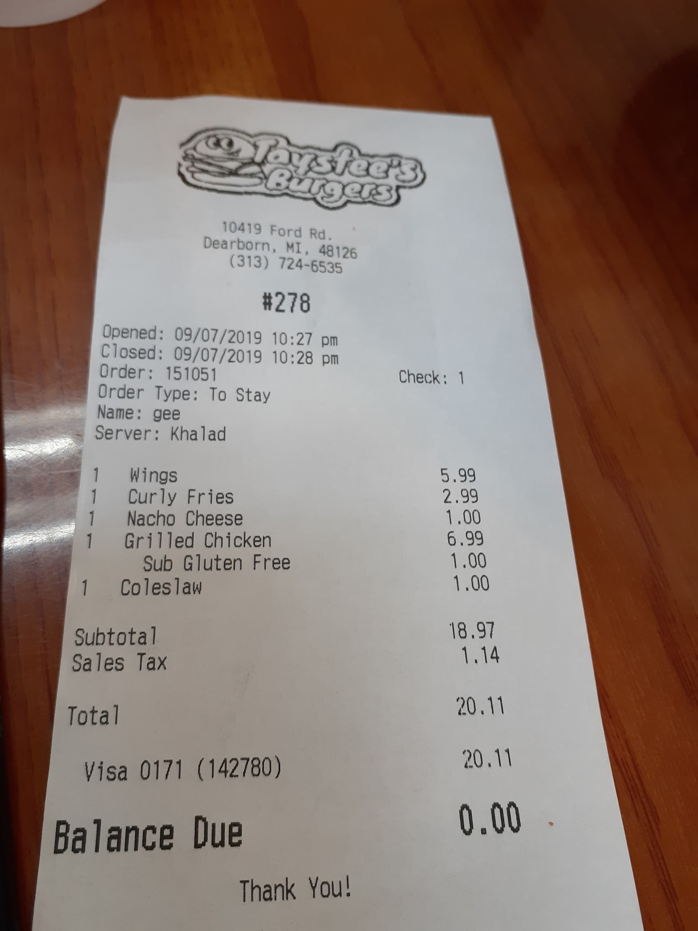 Read moreI was going to give a 1 star review, but I decided not to; I thought Haram. I went in with a friend, we ordered our meals, and it was wrong from the beginning. I asked for a chicken burger, gluten free bread, no cheese and Cole slaw on the side. My friend ordered chicken wings, and curly fries. They gave me his curly fries with my burger and no coleslaw. When asked to switch the burger onto a different plate, and add coleslaw on the side, we were looked at funny; as if the employees were flabbergasted at the thought that they may have got the order wrong. They separated the orders, and put the Cole slaw on my burger; instead of the side like I asked. I took the cole slaw off, took a small bite, and realized there is cheese on the burger; I'm lactose intolerant. I took it to the cashier, he was very nice and said they will remake the order. While I waited, I asked the line cook to make sure it's a gluten free bun, I also have a wheat allergy; his reply was very rude in tone, and seemed as though he was displeased. When my order was finally finished, it was handed to me by a different gentleman, to which I said to him in Arabic الله يسلم يديك. May allah bless, or bring peace, to your hands. He said sorry, which I respect him for doing instead of being rude. All in all, the food was very good; just some miscommunication. I hope they realize, that they shouldn't be rude to customers; or employ someone who looks displeased with his job and has to be rude to customers when he screws their order up. The cashier was very cordial, and respectful, so was the guy who officially showed me there is no cheese or coleslaw on the burger before handing it me with an apology....