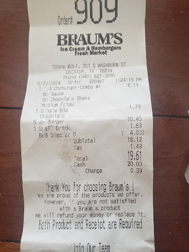 We’ve never had an issue at any Braum’s before, however this time we asked the cashier if they provided discounts to veterans, we’ve never asked before but thought we would this time.