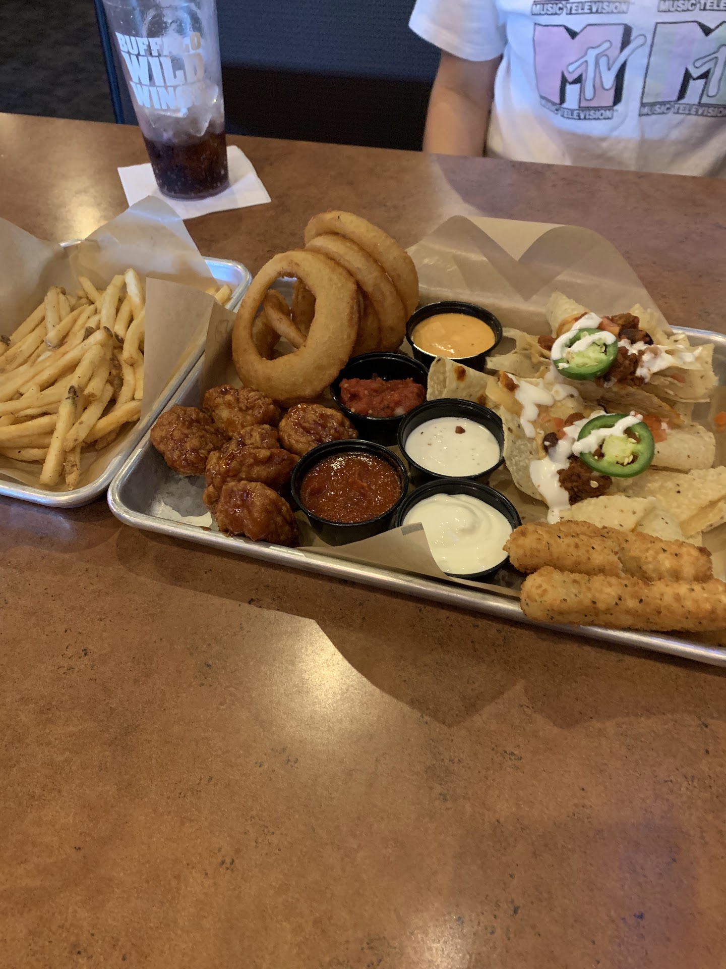 Read moreIt's becoming impossible to enjoy going here. The food good, beer is definitely cold. However, twice in a month we have been told there were no booths available. The first time I literally stood there and counted the empty booths in front of her. She said "yes ma'am but we're in the middle of rotation so there's none available." Whatever. Then the last trip we walked out. There were people standing and waiting to be seated everywhere. She said there would be a 40-45 minute wait. I looked up and counted 8 empty booths, didn't even count empty tables. I asked why such a long wait when there was so many empty booths? Her reply ... "we had 5 parties of 10 come in so we're not seating anyone to let the kitchen catch up." ... I mean what?? Can you not seat people and let them wait at their table as easily as you can make them wait standing around uncomfortably? You simply inform them it's taking longer than usual to get the food out due to the large parties and the kitchen being backed up. It takes FOREVER to get your food there as it is! We walked out and went somewhere else. When we left our chosen restaurant after finishing our meal, my son texted his friend whose family had stayed at Buffalo Wild Wings, they had been seated, but they had not even gotten their food yet. It had been an hour and 45 minutes at that point....
