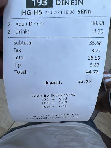 Read moreThe food has always been pretty decent. But my husband & I went there for lunch yesterday, I was in my work uniform since I just got off work & the man who seated us asked me if I was EMS & was reading my shirt. I told him I worked for Fire & Rescue & he walked off without saying anything. During our meal, our waiter not once came to our table to refill our drinks or even speak to us. We were pretty over the whole thing, so we went to pay out & the same man that seated us was the one at the register. As we were standing there, my husband noticed a sign on the wall that said Discounts for SENIOR CITIZENS, EMS, & POLICE ONLY!! I wasn't upset that I wasn't getting a discount..I was upset that they don't think our firefighters deserve the same treatment, considering the fact they are EMT's as well as everything else they do. You give SENIOR CITIZENS a discount, but not a FIREFIGHTER who saves lives & would be the one to the rescue if your building was burning to the ground, or giving you medical care if you were in need. I just think it's really shot out & I'm down right disappointed in this place for that! Have always liked this place, but everything about our experience yesterday & that included just left a really bad taste in my mouth and I lost all respect for them. Not sure we...