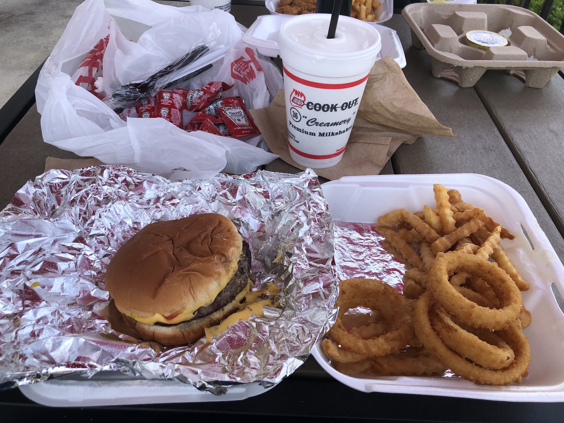 If you love burgers but are tired of paying through the nose to feed your family look no further! Cookout has a huge selection of burgers and chicken cook all diffrent way or ready to be made to your specific liking. They offer box meals that come with 2 sides and a drink that will without a doubt fill your gut and spare your wallet. The sides (none healthy) are a huge variety ranging from your normal fries to corn dogs to quesidilla to coleslaw. You can order a diet soda saving you some calories or go all out and choose from the largest selection of milkshakes I've seen. If you are not happy with any of their creations you can even customize your very own milkshake. They offer lettuce wrapping any of their sandwiches if you are looking to be healthier. Service is quick and staff are generally...