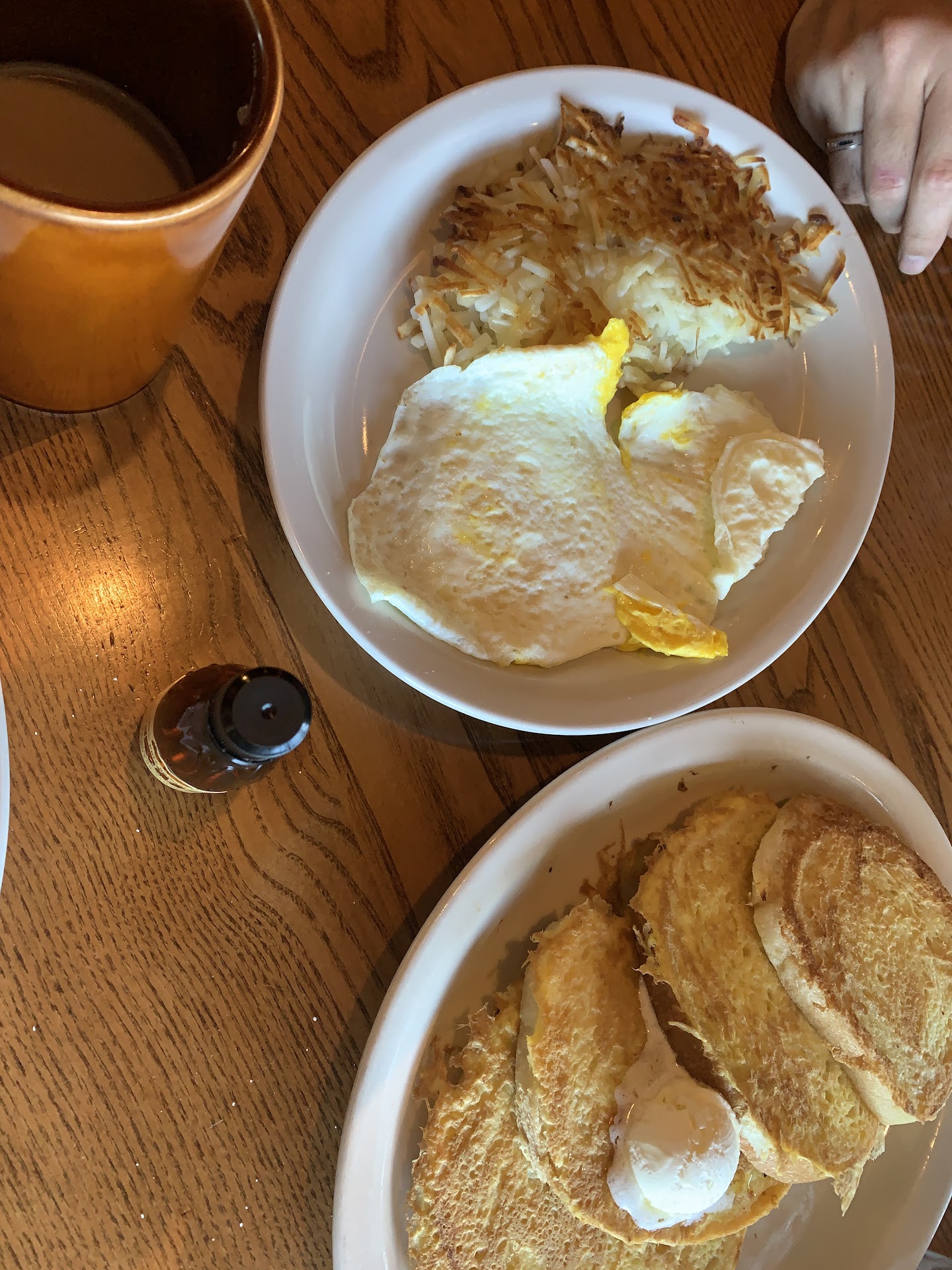 When our entire party (8) arrived our order was taken and placed. As our order was close to be completed we were told that they were out of the apple French toast and it would be 15 minuets before it would be ready. the gentleman who had ordered the the French toast said he would wait and then we he was offered and starter if fried pickles while he waited. In about 10 minuets 6 of us received our food. We had not been given any silverware and asked for silverware and waited about 5 minutes for it to be brought to us. We received 2 chicken BLT sandwich plates, were only ordered one, we got 1 chicken tender plate but had ordered 2. the chicken French toast plate did not come with butter, the biscuit basket was delivered but no jam or jelly I was lated told that they only serve jelly at breakfast otherwise you have to ask for it), We asked for jelly but never received it. I had a loaded baked potato but by the time I got my silverware (which was 2 forks no knife) it had cooled down.