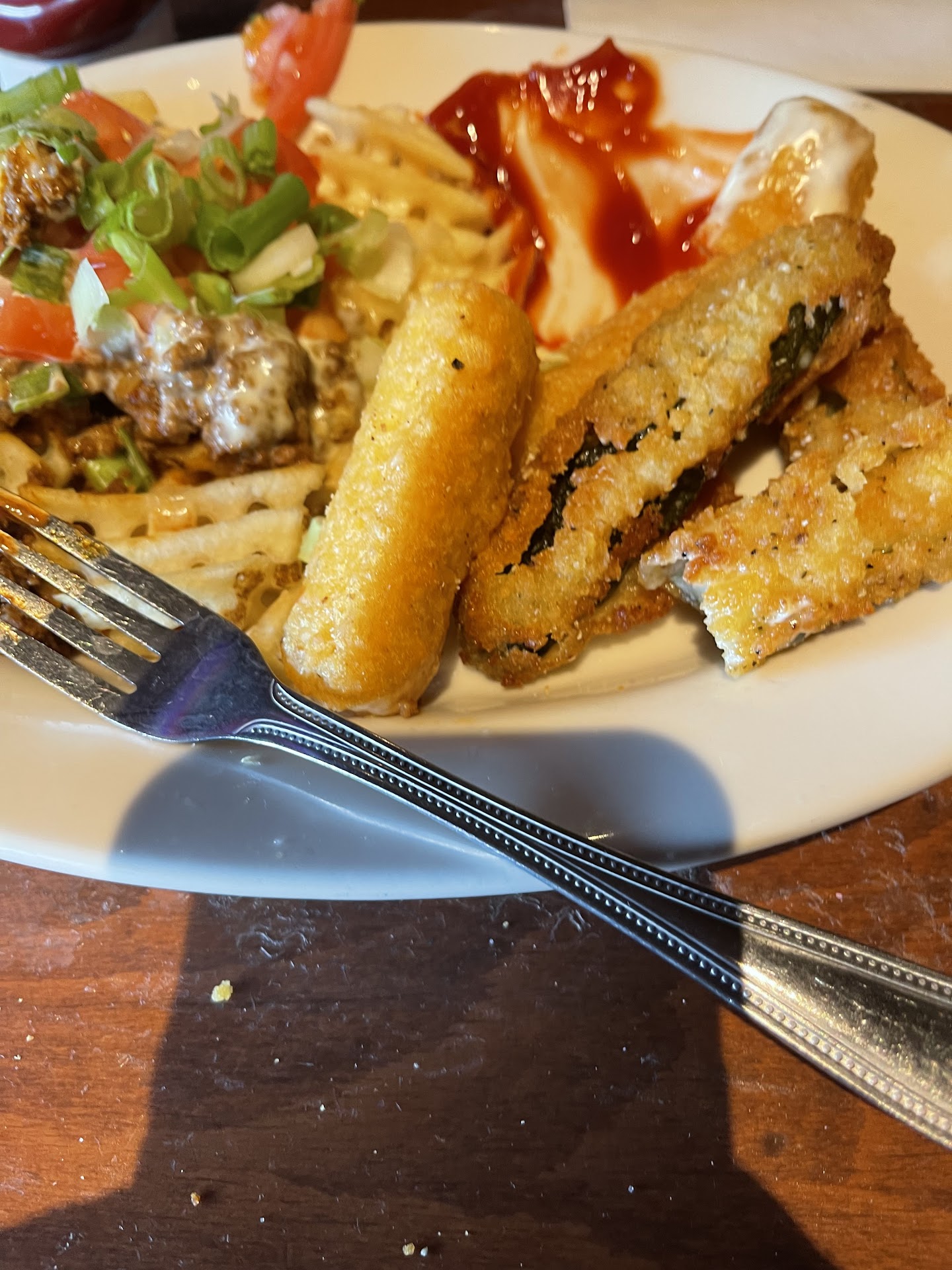 My boyfriend ordered the grilled salmon which I tried and it was delicious(first time i've ever tried fish),and we got a combo as our appetizer(we picked fried pickles,mozz sticks,and garlic bread)and they were all very good as well! Over all,i'll probably end up going again sometime since it's in town,and they were...