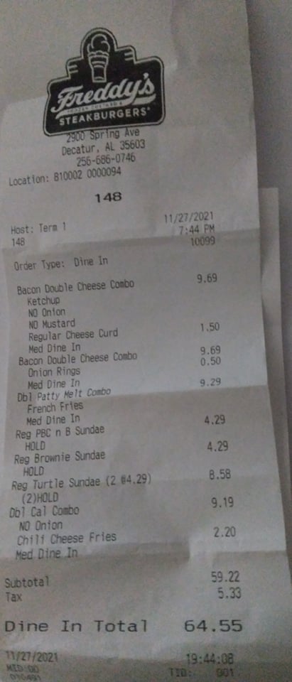 This is the last time I will ever go to Freddy's. Tonight we go to Freddy's for a little family dinner. We order our food and sundaes. We had our sundaes put on hold until we finished eating. The food we received was excellent. The young lady who took our order was great!