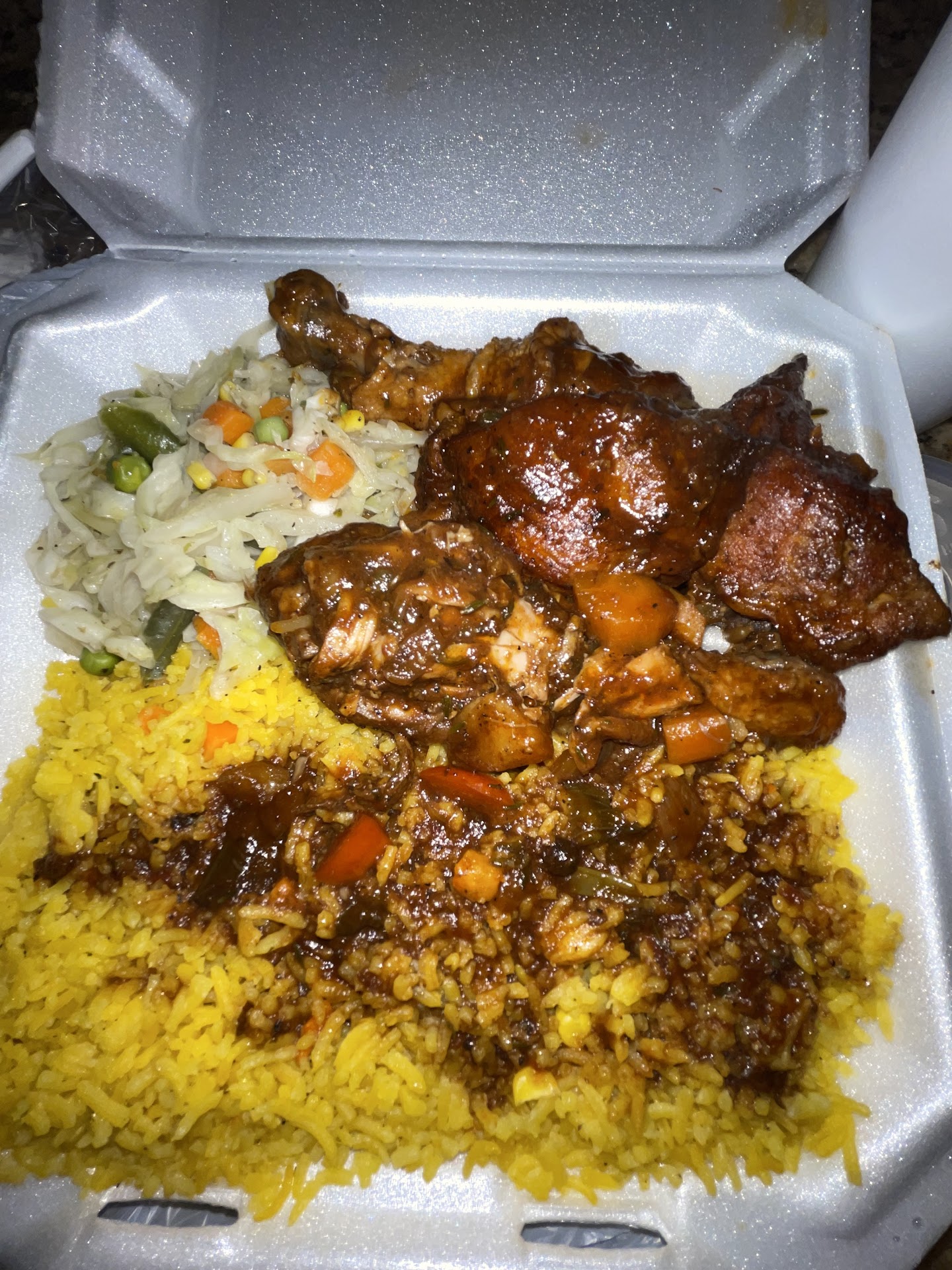 Accompanying the chicken was yellow rice, expertly prepared and generously coated with savory gravy that complemented the dish beautifully. The rice itself was fragrant and cooked just right, making every bite a pleasure. Alongside, the steamed cabbage stole the show with its bold flavors and tender texture, showcasing J&J's expertise in blending traditional Jamaican ingredients.