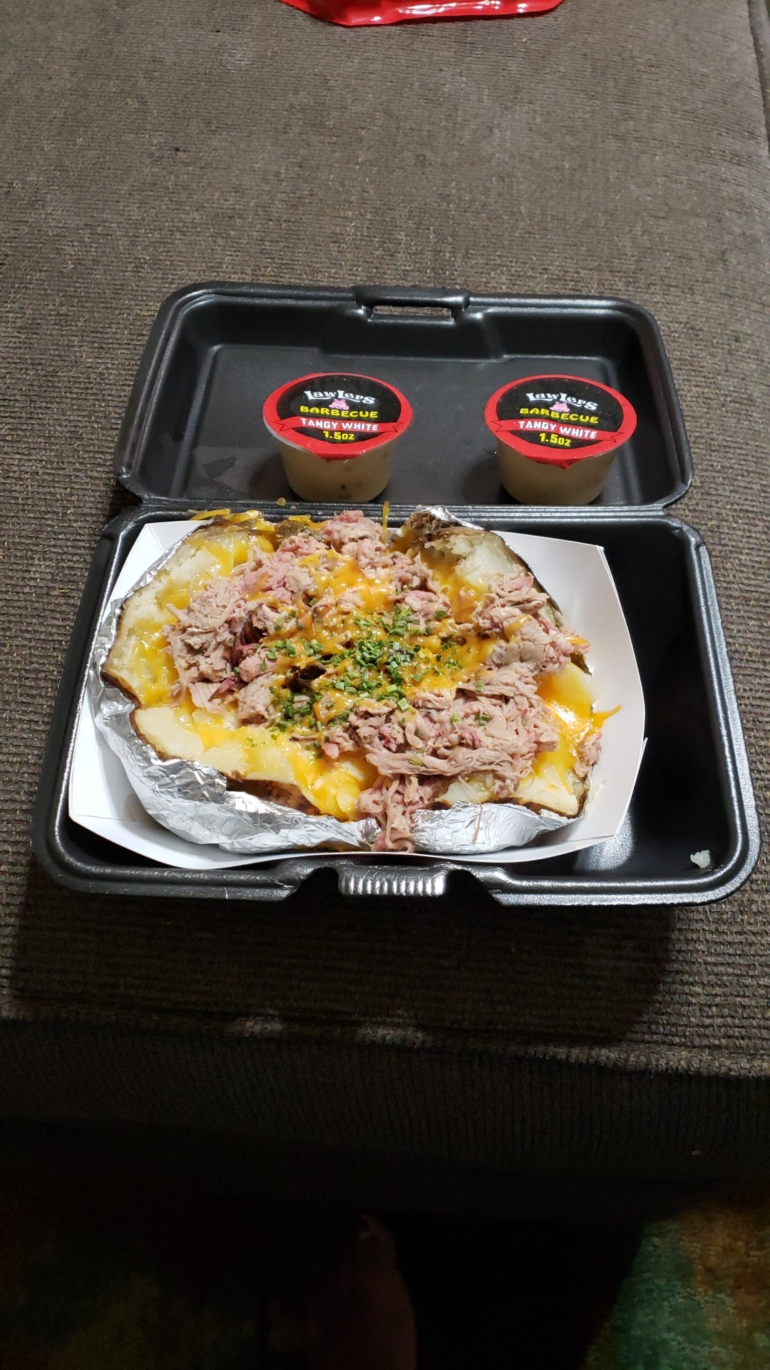 Read moreWe got take out. Place was empty when I walked in. Diner style tables weren't very clean. People in Alabama can't seem to find the garbage bins I guess. Having said that the food was great. Wife got some pulled pork thingy which she loved (as did our dog) and I got the loaded baked potato. OMG. That could NOT have been one potato. It was so large I'd say it was the size of 4 medium potatoes you'd get at a grocery store. I did my best to stuff it all in but left a few bites, which again our dog appreciated. We'd order take out there...