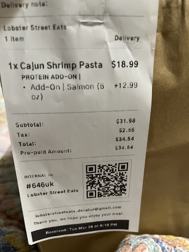 Read moreIf I could rate 0 stars I would. Don’t waste your money here. Not a real seafood spot. The pasta is WATERY, not creamy or cheesy. The peppers are in fact raw and crunchy, and not sautéed, give or take it taste microwaved and the lobsters is well overcooked, very chewy and rubbery. For $30, the portion was very small. There’s definitely nothing Cajun about it, tastes like milk with HELLA peppers. There are shell fragments in the lobster pasta, so be aware. I also ordered crab legs so I will come back with a review on those.