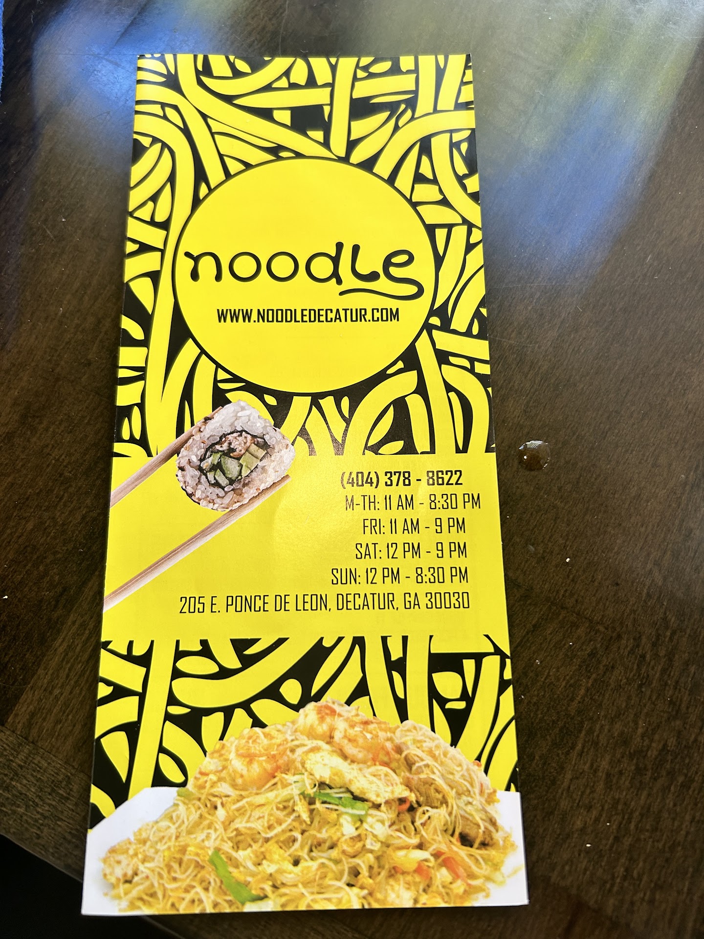 Read moreI was in downtown Decatur for an appointment and wanted something to eat. I was just looking around on google maps and Noodle came up. I was planning to dine-in but when I arrived they were only doing takeout at this time. I ordered regardless because they had some outdoor seating available. I got vegetable spring rolls and chicken lo mein. Just wanted something classic. Everything was done pretty quickly within 15 minutes. Noodle, seems to be very popular on doordash and other apps because they were a lot of people picking up orders and stuff. My overall opinion of the food was underwhelming. The lo mein noodles were not very flavorful and the chicken were big tough cuts of white meat. The vegetables weren’t really uniform throughout and eating it out of a to go container was difficult. A plus is that you do get a lot of noodles probably enough for three people but still were very average. The spring rolls were the generic rolls that you could find at any asian restaurant. I spent around 17 dollars in total and personally it wasn’t worth that price. If it was less expensive than maybe my view would be a little better but I could pay the same at any other place and get...