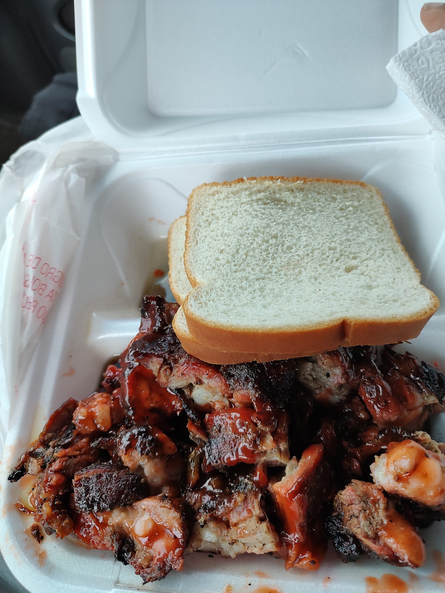 This is a small bbq joint with no inside seating. So just take your order to the car, that smells is gonna get to ya'... don't openthat plate, it won't make it home! Usually, the ribs and tips are really tender, and the meat just comes off the bone. Well, due to the holiday orders, maybe they marinated or cooked the meats a litter faster than usual. The meat wasn't quite as tender as usual. My elderly family or the children couldn't really chew it. Kinda tough to me, so we put it on low in the oven with some broth. It's not the same, but softer. As for the rib tips, well, I don't like it when they double cut the tips! That happens around the busy times, maybe so they can have enough for more orders. There is no price difference! This had to just be an off time for them cause I plan...