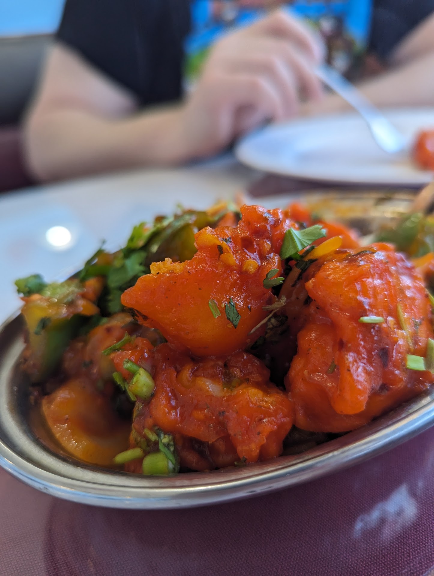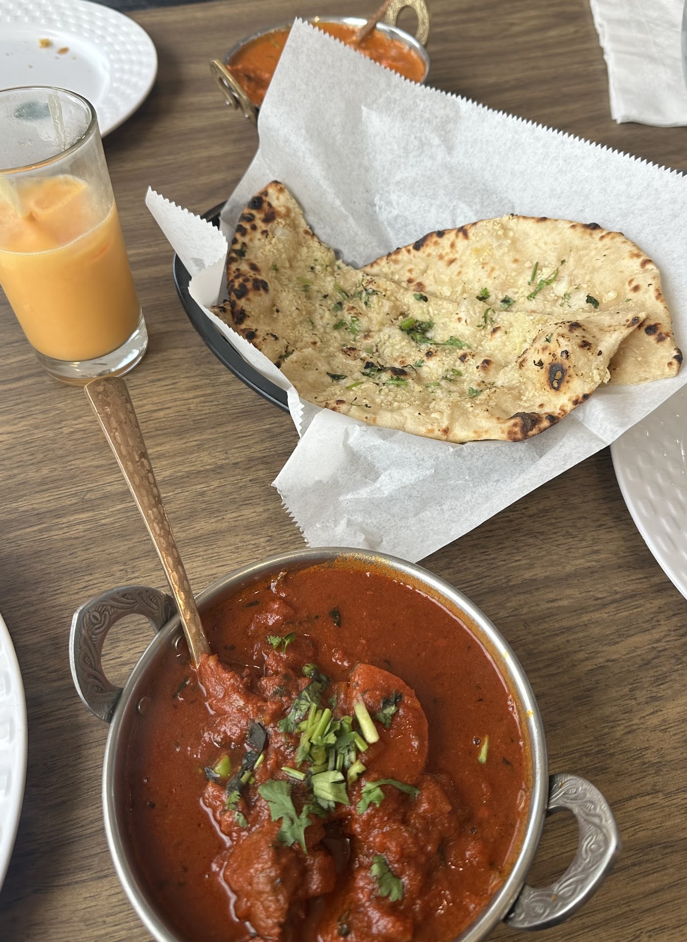 Our first visit here went very well. They seem to do a higher takeout as opposed to dine in service, so we got seated immediately. Very relaxed atmosphere, and the servers couldn't have been nicer, or more attentive. I chose the butter chicken as my intro to Indian cuisine, and I was not disappointed. I went for the mild version with Naan. It had just a tiny hint of spice, which for my palette, was perfect. My only recommendation would be to select rice as your accompaniment, and order the Naan on the side. The reason being is because the butter chicken is more like a chicken based, exotic tomato soup, and I felt the rice would have been a better choice to soak up the liquid with. The Naan was delicious all on its own. My hb had the mushroom chicken, spice level medium hot. As someone who practically eats jalapeños like candy, he said it was almost too spicy, which made me laugh, and want to ask the waiter to bring out the water pitcher and douse him. Lol But he still ate every bite. The creamy rice like pudding they gave us at the end of the meal cooled our palettes, and was delicious. We'll definitely be back to try perhaps the...