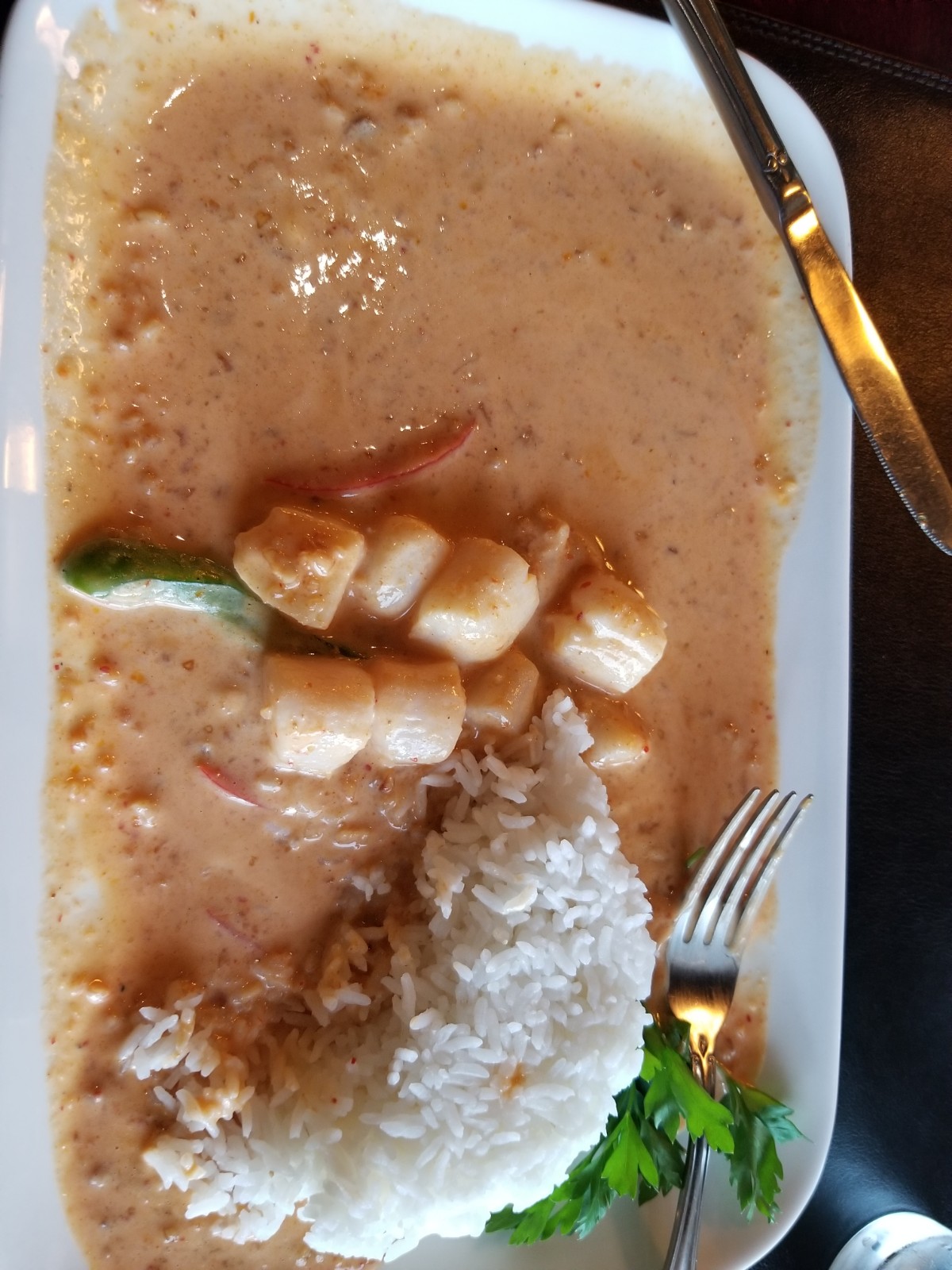 Service Is Everything!! My family and I have patronized this establishment many times in the past, even with their mediocre service. We kept going back, because the food is actually pretty good. But today's bad service was enough! Let me start by saying that the error partly lied with me. Yes, as a customer, I can admit when I, too, am wrong. I ordered the Panang Curry dish and forgot to advise the server to omit the peanuts; so when I got my dish and tasted the overwhelmingly crunchy texture, I asked a server if peanuts were included and she replied "yes" and walked away. I tried to tolerate the dish and ate a couple more bites, but the abundance of crushed peanuts became unbearable. The other server must have noticed the displeasure on my face, because she walked directly over to our table. At that point, I asked if I could replace my sauce with one that excludes peanuts. Her response: "but you have already started eating." I replied advising that I was well aware I began eating -- I was simply asking for sauce without peanuts. Her next response was that the menu reads the dish includes peanuts. Can you believe this?!! She eventually replaced the sauce, but what she brought out was far less (a tiny square bowl) than what I paid for. To make matters worse, when I asked for a different plate (mind you, I had to ask for a different plate), she handed me a small appetizer plate to transfer my rice, scallops and second serving of sauce into (see attached photos). We have certainly noticed a decline in their customer service since changing mgmt, but still chose to patronize their business. Well...many times in the past, but...