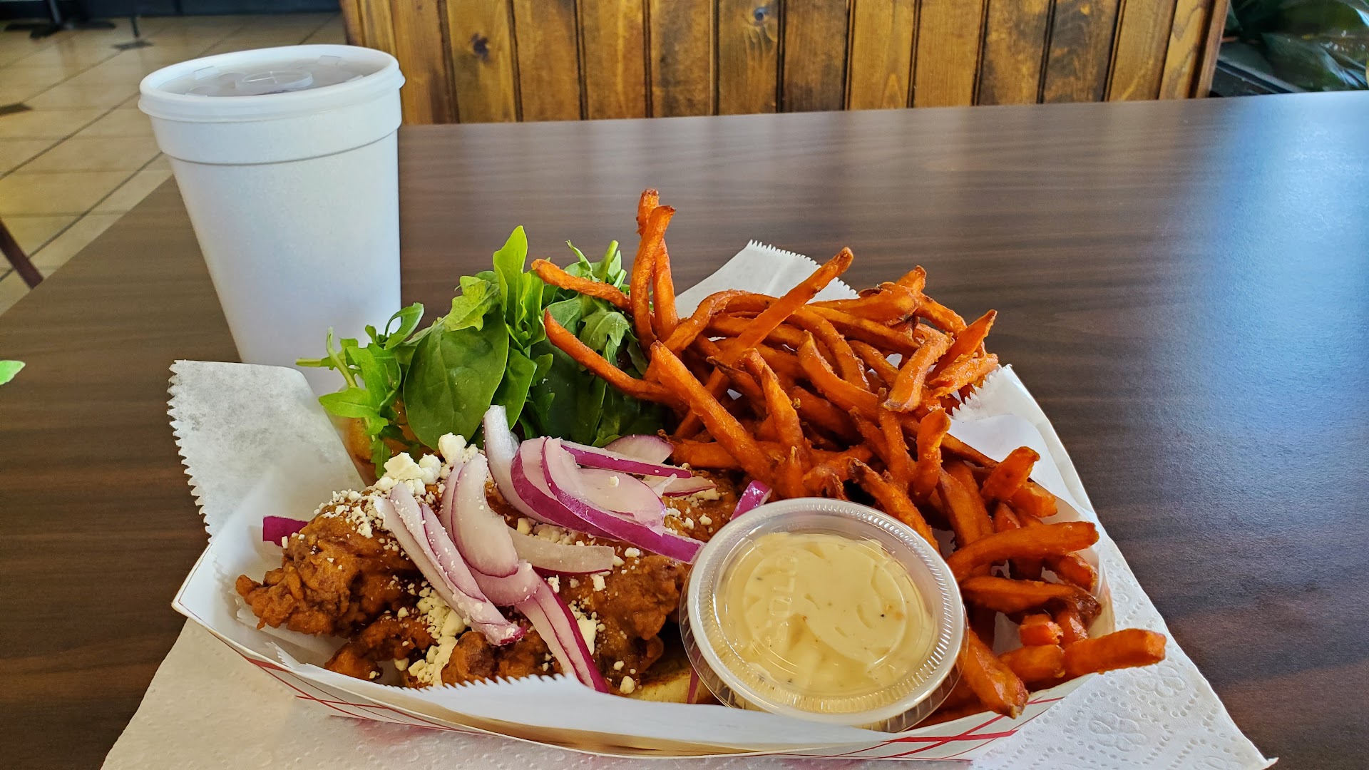 None of us were impressed, the chicken was overcooked, which reading the comments seems to be a common problem they have. Also, they needed to change the oil in the fryer, you could tell by the taste of the chicken. The sweet potato fries we’re SO overcooked that they were just crunchy brown blobs.