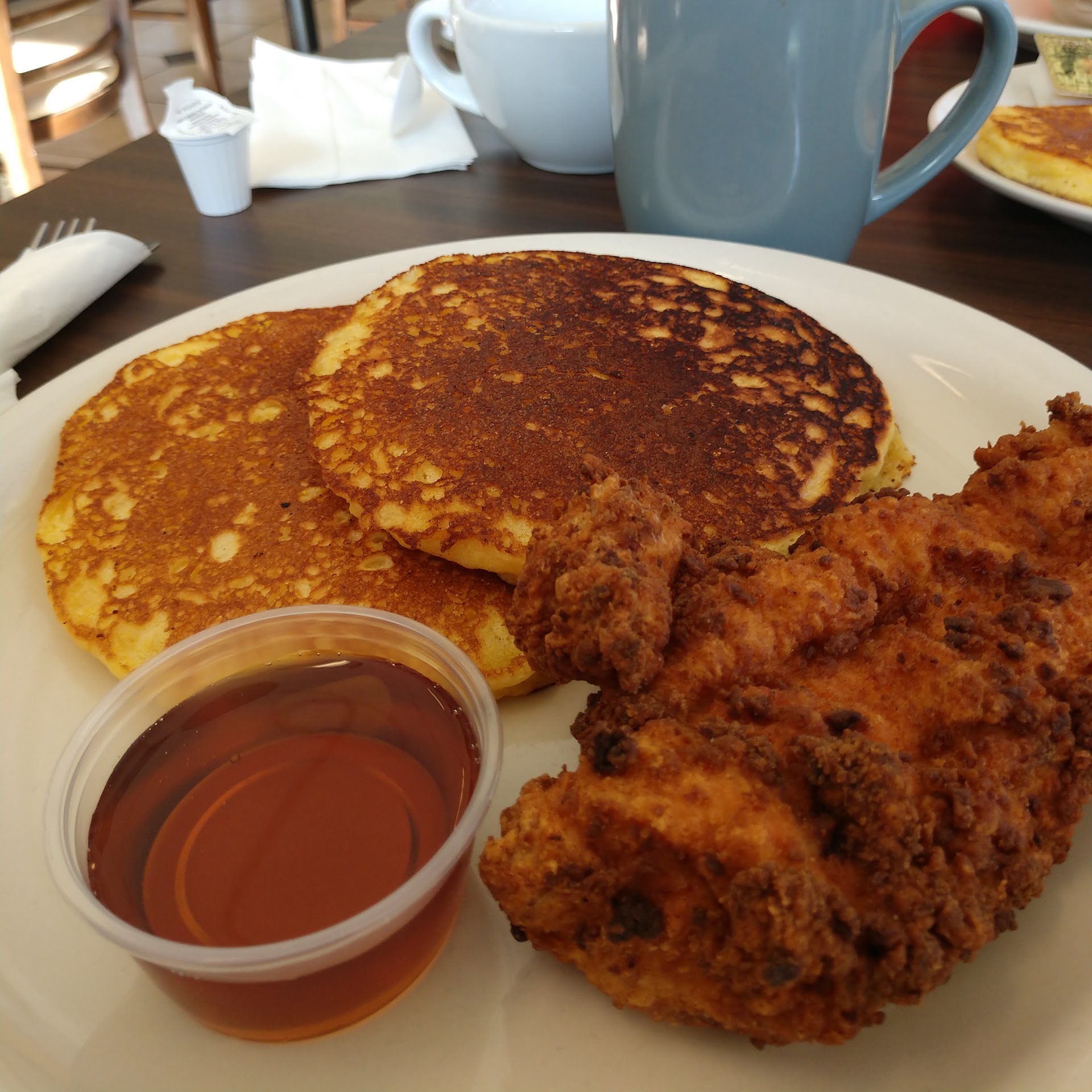 Next breakfast I had was the Chicken n' Hoecakes because it combined the two things that stood out most to me: chicken and cornbread pancakes.