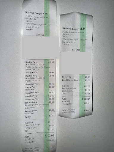 I am extremely disappointed with the service at Smileyâs Burger in Downtown Decatur. Parking isnât idealâHoward Street is always congested with limited parkingâbut we luckily found a spot right in front and decided to give it a try. We placed our order and even added an order of fried cheese curds after seeing other customers eating them.