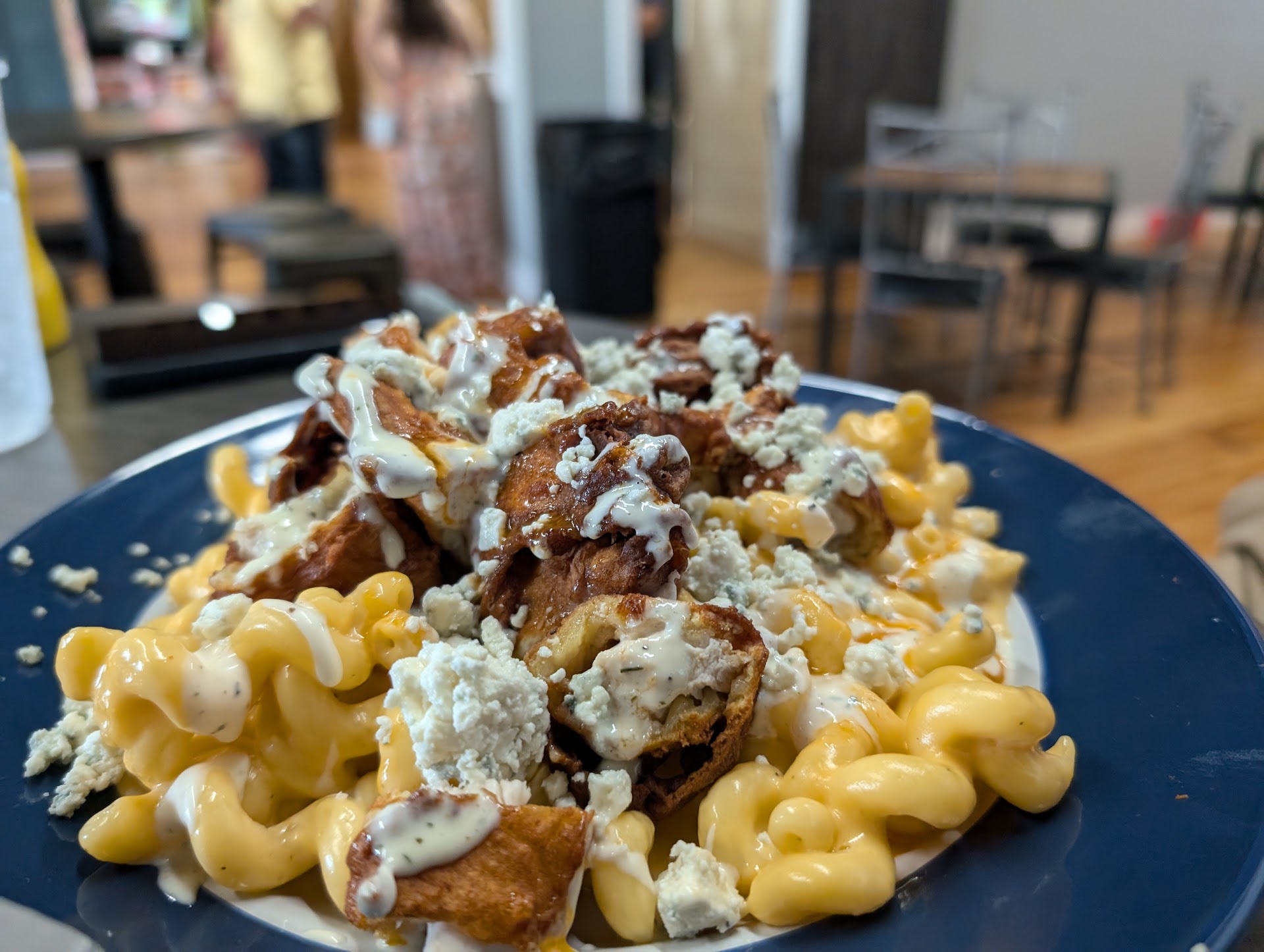 I'm giving a five-star for the food, the food was phenomenal.. but 2 stars for service... 3 star overall. I took my daughter tonight during third Friday and I got the steak truffle mac and cheese bowl and it was to die for! However the service was not ... I sat there for 10 mins before someone took our drink order and gave us menus. I was sat AN HOUR total before I got my food. I think they forgot all about me because another table of 5 came in 15 minutes after us and had their food in 10 minutes and was eating by the time I finally asked where mine and my daughters was at. We also sat with empty drinks for about 10 minutes. So we arrived at 7:04 p.m. and didn't leave until 8:25 p.m. but it only took us 10 minutes to eat. Finally we got our food!!¡ I know they had a busy night but everyone else seemed like they had fine service. The food was incredible even other people's plates looked so delicious as they passed by but on the way to the bathroom, I saw one of the cooks at the fryer mixing batter with his bare hand and that grossed me out. You can see the whole kitchen on the way to the bathroom, his hands may have been clean, or they may not have I have no idea! It would have been nice to see him wearing gloves and not using his bare hand to mix batter and batter chicken.