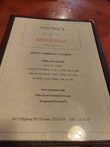 This was our first time having eaten at this place. Having seeing the reviews and how long they had been in operation, I thought we would give it a shot. First of all I need to say that the service, salad, and tea was very good. Other than that it was all downhill. Our meal consisted of stuffed mushrooms for an appetizer and Chicken Marsala for my wife and Chicken Florentine for myself. A salad and bread was furnished on the side. This is the 1st Italian restaurant that we’ve ever eaten at that didn’t serve an olive oil with herbs for dipping. We had to ask for it and we’re charged for it. We dipped our bread in it one time and that was all it took to say no more. It had a herb in it that looked like finely chopped parsley. It tasted like it came out of and out of date batch purchased at WalMart. The bread itself was room temperature and crusty as if it had been sitting out for a while. As for the Chicken Marsala, the chicken was over cooked as if it was a leftover and microwaved. The sauce had no flavor to it except for tasting a little overcooked. The Chicken Florentine too had no flavor and the chicken prepared the same way. The cheese sauce is usually creamy, but this poured like water. As with the dipping sauce, it too had what looked like finely chopped parsley. The mushrooms are advertised as being stuffed with crabmeat. The mushrooms were about 1/4” thick, cooked, with mainly cheese in it. You could feel something grainy in it which I guess was the crabmeat. In no part of it could you taste a hint of crabmeat. From now on we will travel to Wichita Falls or Ft Worth, depending on what direction...