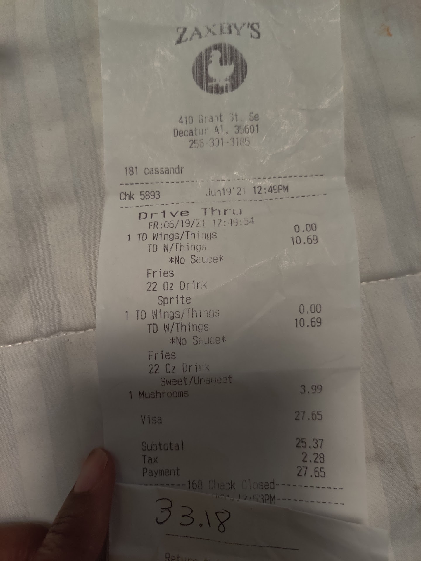 Read moreI love zaxbys food but it's sad when you go to a location and approach the counter, wait about 2 minutes before anyone notices me, including manager and the girl literally walks up and rolls her eyes like she had "work" to do and turns her hat around backwards before saying obnoxiously "dine in or carry out?". she had a hard time taking my order and money due to a conversation about her school day with a co-worker, I then had to listen to what sounded like a kindergarten classroom of loud children. Best part is the manager is on her phone and in the kitchen. Got sauces wrong with wings and fingers, no season on fries, white cheddar bites were burnt, sauce for ched. Bites was bbq not maranera. I'd say the only things right were my drink and sauce packets. This store needs to be completely cleaned out or this poor city...