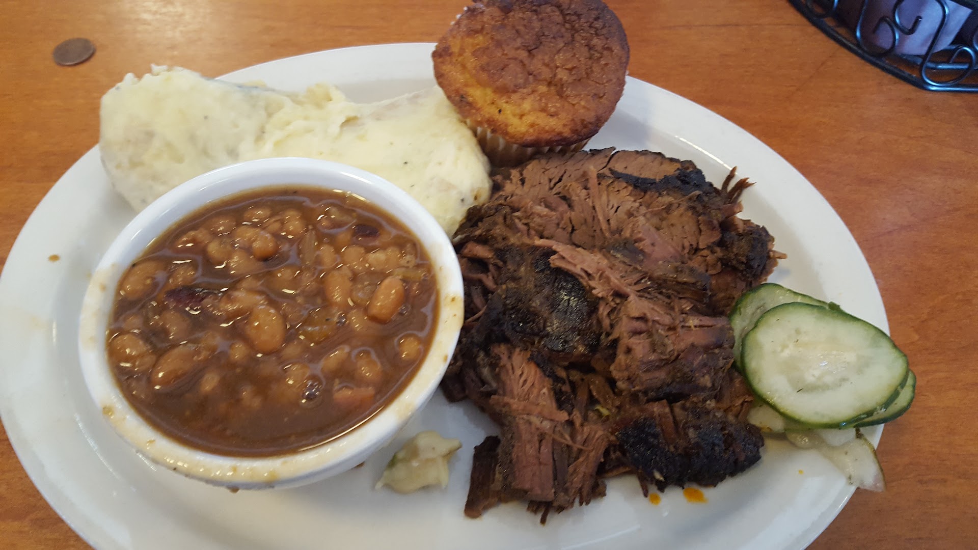 Food: Very disappointing. As a starter we had Iowa nachos. These were OK. I ordered a beef brisket platter with smoked BBQ beans and house fries. The beans were delicious and the fries were good. The meat had no taste at all. I had to use a lot of sauce to eat it. My wife had baby back ribs with mashed potatoes. The mashed potatoes were really great, but the meat (again) had no taste. She tried putting sauce on them, but she gave up.