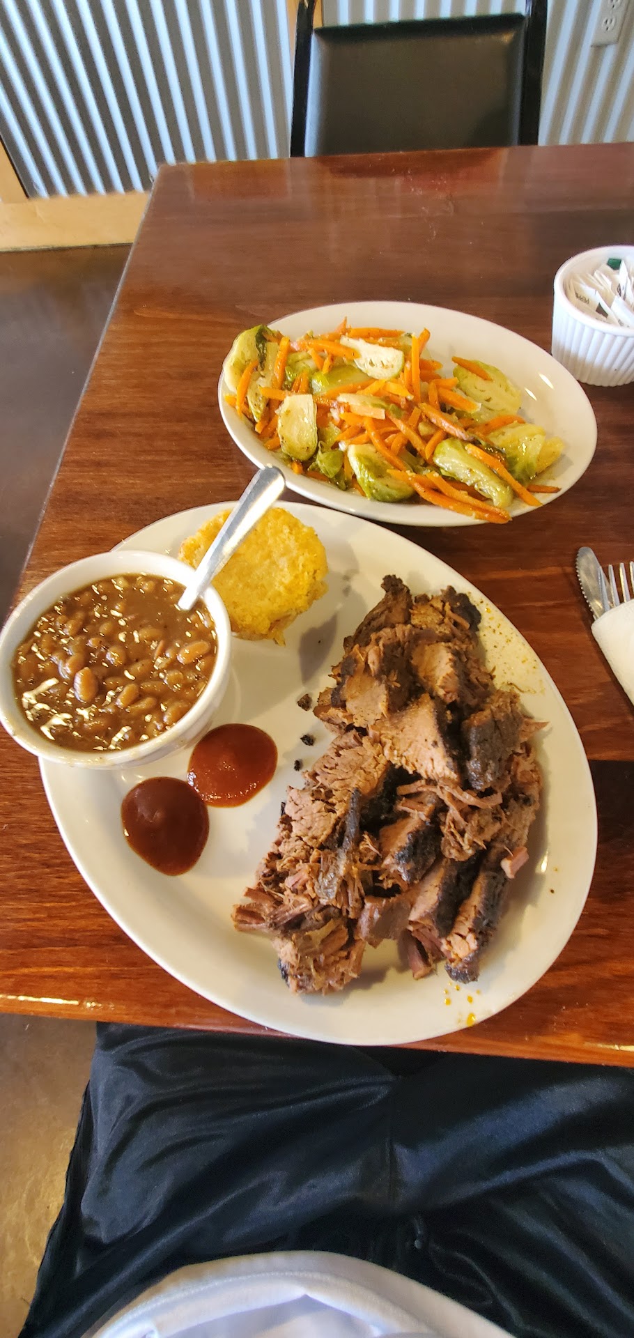 Menu is small, however this is not a bad thing. Everything is represented on the menu that you would expect. I prefer this as it tells me they specialize on what they are, a BBQ joint, and not cafe style with a thousand different things but great at nothing. They are doing what they do right. 5 sauces at each table for whatever hits you at the time you eat. You will find one you like. We settled on the Kansas City as it is a bit sweeter. It's the style I prefer when I light up my own pit.