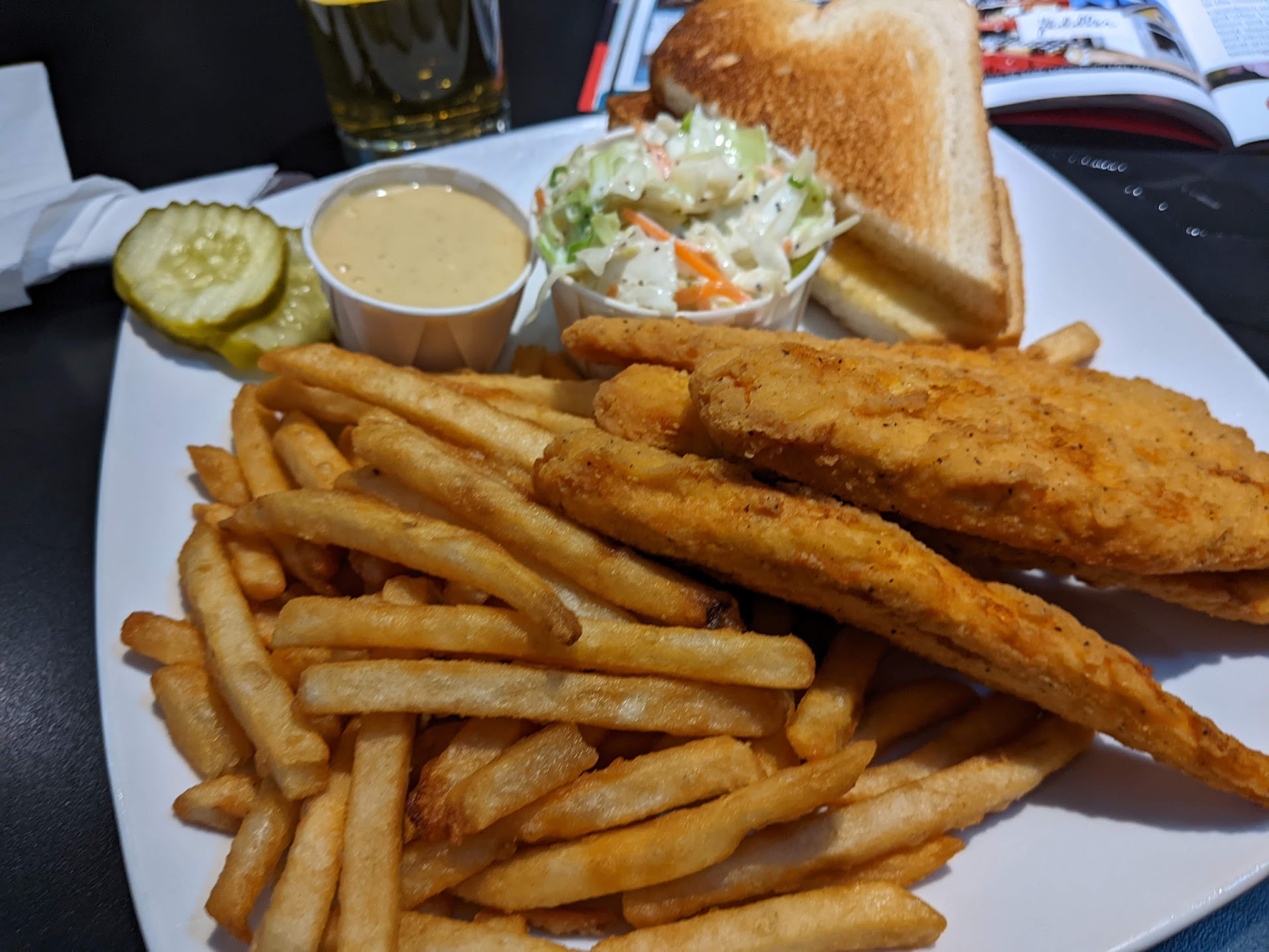 Then came the meals themselves. Good news first – the BLT and fries was pretty darn good. Nicely toasted bread, a good balance of meat to veggies and the right amount of mayo, but friends… these are NOT chicken strips! These are chickie nuggies at best and the thing I always fear when I roll the dice on ordering chicken at a bar. I guess I expect for $13.50 that there will be actual strips of chicken tenders. Juicy and meaty…the kind I can peel the breading off of (my favorite way to eat chicken) first and then dunk the meat into the sauce. But no – these are sad and spongey affairs and frankly sucked. The coleslaw was GREAT, so you should definitely get that, and I always love a beer-battered fry.
