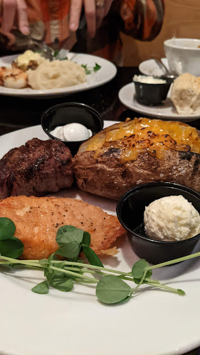 Now for the food - amazing. Without all the seasonings I am accustomed to normally eating, I was reserving myself to a bland steak and salmon and baked potato to fit my medical diet. Boy was I surprised that he used smoke to flavor the potato and used what I could eat for toppings. If these pictures could talk... The steak and salmon were cooked perfection. Quality ingredients that stood out with simple seasonings and expertly prepared. My husband shared that his meal was equally amazing - with even more flavor!