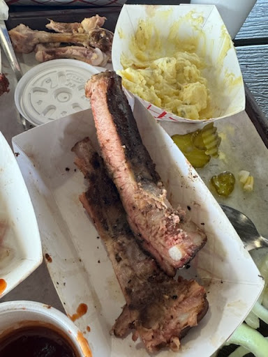 Our first visit having BBQ, wasnât the expectation we were looking for. Itâs OK, but not great. We had one 3-meat plate with sliced brisket, smoked sausage and ribs w/onion rings. The brisket was on the dry side, the sausage was room temperature and 1 rib(med-small) the onion rings were t cooked enough for our liking. The other plate was sliced brisket with added potato salad and beans. ALL sides are a separate cost. The pricing is WAY too high, especially for the quality and quantity of the food items. Hubs loves banana pudding so he wanted to try it, so we got that to go. Total disappointment as we paid $3.50 for literally a heaping tablespoon and it was disgusting.