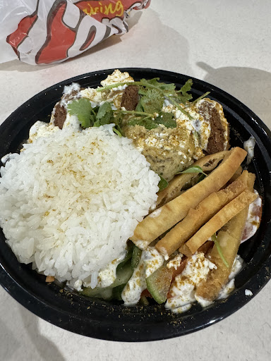 I’m used to a different type of tikka masala so IMO I didn’t really like the one here. It wasn’t very creamy, and very heavy on the tomatoes. I’m going to dr it up at home with some coconut milk. I also ordered the falafel rice bowl which I liked UNTIL I took a big bite of hummus. Idk what they use for hummus but it tasted like how barns on farms smell. I make hummus at home so again I’m used to something completely different. I would absolutely get the falafel bowl again it was very fresh and the falafels were tasty. But no hummus for me. Last thing I ordered was garlic naan. So good!