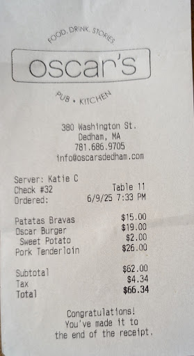 Read moreMy husband and I went to dinner at Oscar's and had the most fabulous time. The cocktails were amazing (I definitely recommend the Citrus Mule if you are looking for a refreshing summery drink!) and the food was so delicious. We ordered the fried pickles, lamb samosas, the cuban, and the fish and chips (I very much recommend getting a side of curry sauce for dipping your chips!). I had mentioned offhand that my husband and I would be splitting our mains and when our lovely server, Sarah, brought them out, the kitchen had pre-split the meals for us so that we each had a plate with half a sandwich and half the fish and chips - how thoughtful and above and beyond is that? The service all around was great and Sarah was the best! Attentive and always there when we needed her (but not at all pushy) and just the sweetest. We are locals and have decided we must...