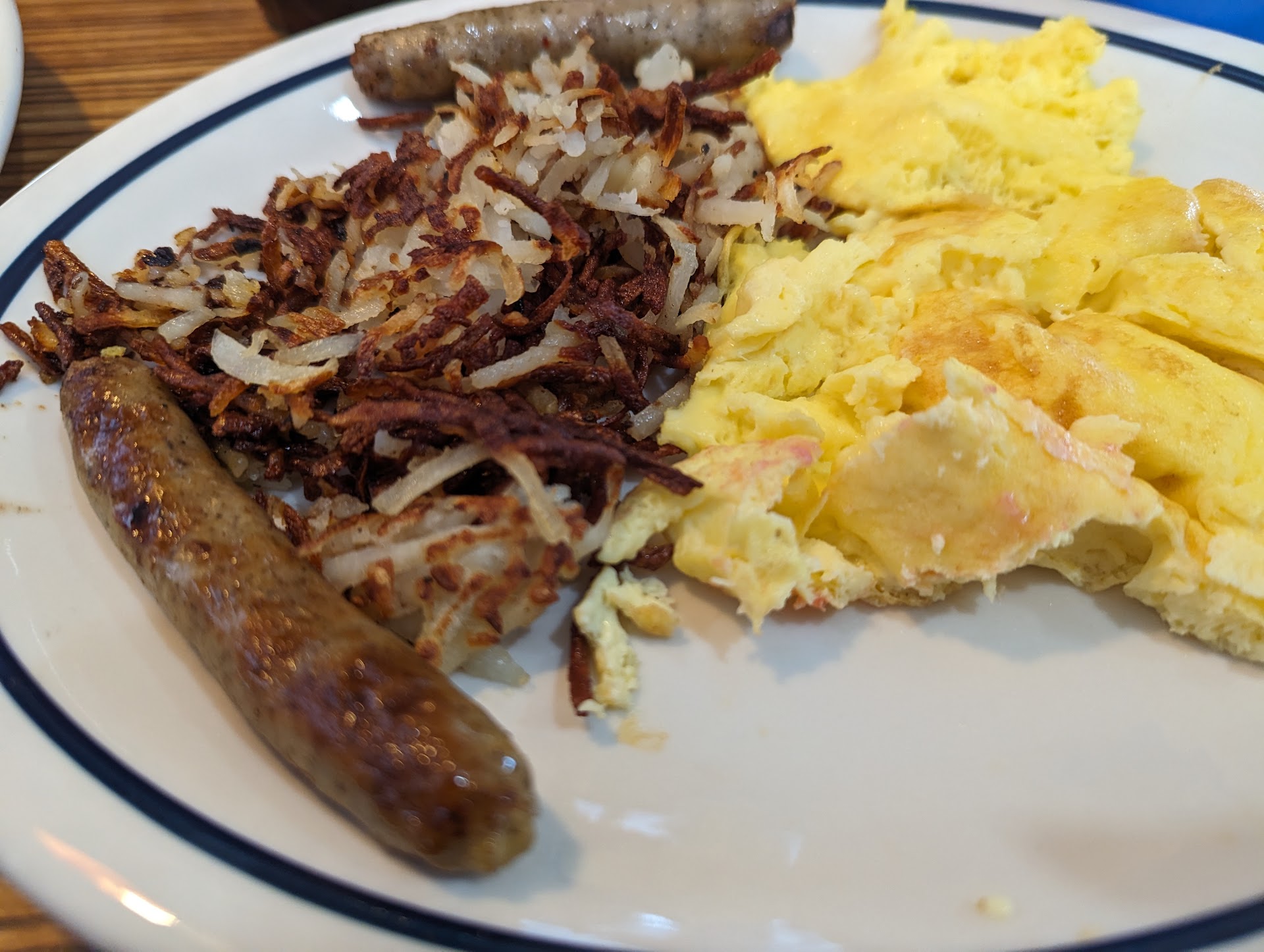 As far as the food, Sirloin Tips, hash browns and two over medium eggs; honestly, it tasted like the food was cooked on a dirty grill. I could only eat half, because I was actually hungry, but couldn't do any more so I ordered more pancakes which came out too fast too have been freshly made.