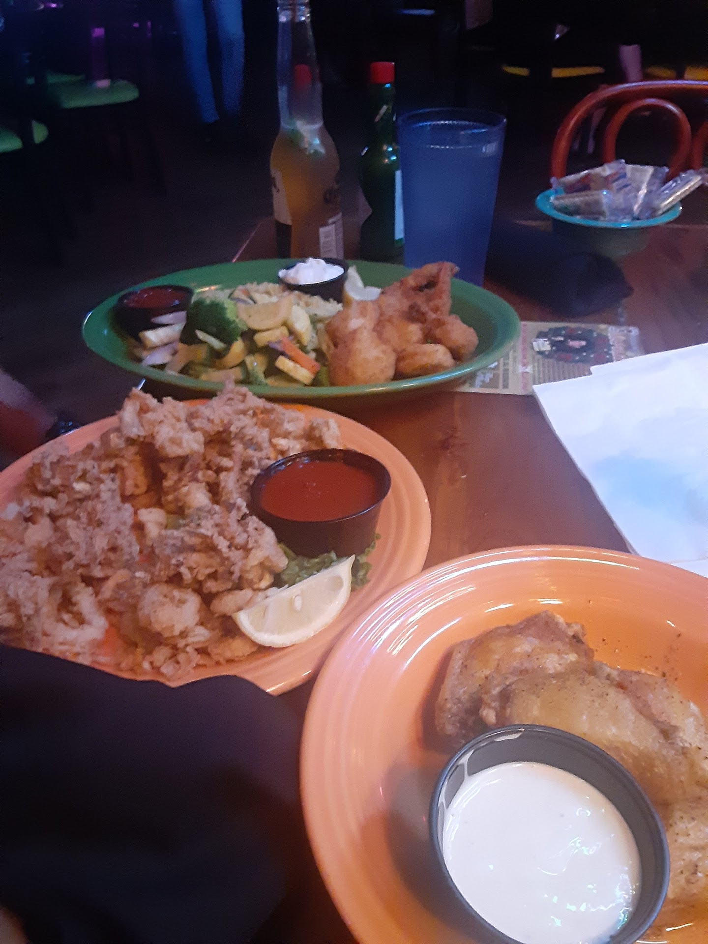 This was the second visit, shrimp was ordered it was the special for Saturdays. Grilled shrimp and blackened shrimp were ordered. The shrimp was a bit over cooked, the sauce served with it had a ranch flavor, this was not too my liking. Then ordered oysters and mussels from the raw bar. They are $0.99 great price can't go wrong with a raw bar. We messed up again and ordered the crab cakes, the presentation was a joke, mango sauce in the middle scared me and it was just fried filler with remnant traces of crab. We had several drinks, it was happy hour $5 drinks and $4 for wine. The Hostess was excellent she took pictures of us. The waitress was attentive.Everything was great! (EXCLUDING the shrimp special and crab)