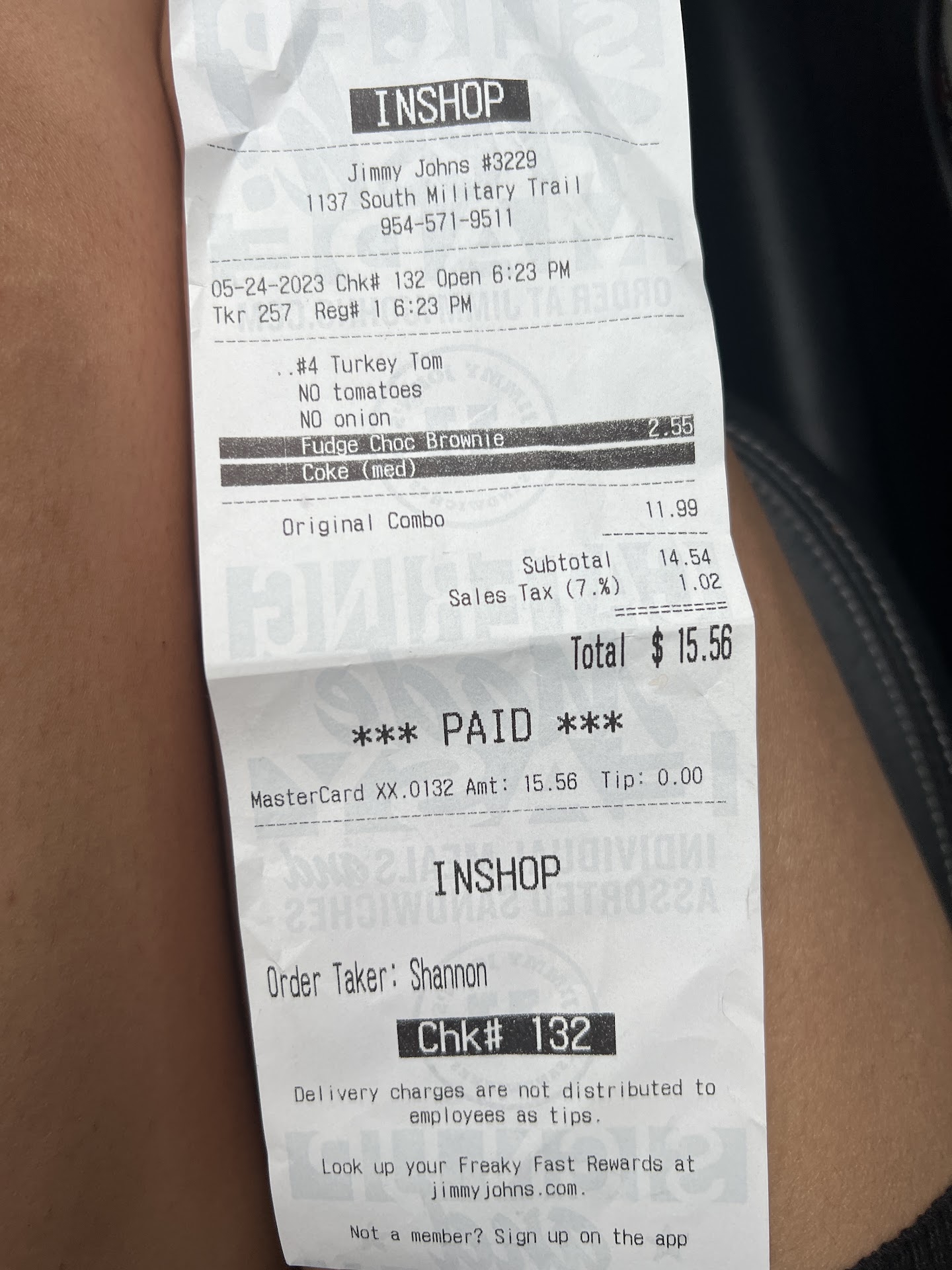Read moreI visited this location and I dealt with Shannon. I ordered the original combo for $11.99 and I was charged $15.56. I noticed on the receipt she charged me $2.55 for the brownie. I called a different location and their manager stated itâs in fact only an .89 cent up charge with the combo. I went back inside and she said thatâs the full cost and the managers are âstrictâ on the brownies lately when she couldâve charged me the up charge instead. She also mentioned how busy the store got today and how much $ the store made within two hours, no wonder why! Your staff is probably bringing all the brownies home or trying to make the $ back on what gets taken daily. I personally feel I was overcharged when my usual total is at around $12.90. I donât get any other extras. Very disappointed, I will stick to my...