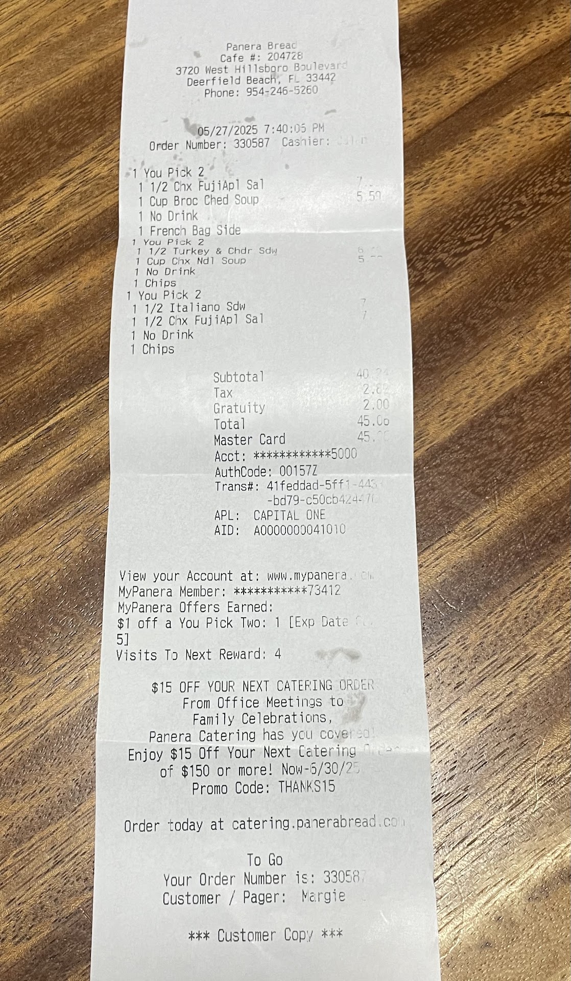 Read moreI have been a loyal customer for years, but this location is the worst when it comes to take out orders! Most of the time they mess up my order, and if you dont personally check your order before you leave, you will drive all the way home to find out and either throw away your expensive meal or drive all the way back to fix it (neither is ideal). Last night was the last straw... I ordered the you pick two with half soup (creamy corn chowder) and sandwich (med veg without feta cheese) to go. I also ordered a bread bown a l carte for another person. Nothing complicated or unique... first, they always mess up and put feta on my sandwhich, even when it clearly says on the ticket NO FETA, so I already know to ask the person making it when they hand it to me if they put cheese on it before I take it... usually they say "oh, oops, I'll remake it". Why cant they pay attention when they read the screen? It says it clearly. So he remade my sandwhich and put the soup in the to go cup and handed me the bag... without the bread bowl... I asked him about the breadbowl to which he responded "you didnt order a breadbowl". I showed him my receipt that clearly said breadbowl and he said "oh, ok" (my point is if I didnt ask for it and just took the bag, I wouldnt have received it). I went home and opened the soup to find creamy chicken and rice- not the corn chowder I had ordered and was clearly on my ticket!!! I am a vegetarian, so that was not an option, so back to Panera I went, asked to speak with a manager, explained the situation and asked for everything new. Matt assured me he would remake the order himself immediately. I trusted the manager (bad idea), took the bag home and by the time I sat down to eat, almost 11 pm due to my work schedule, opened my bag to find the soup was correct, but now the sandwich (supposed to be med veggie without feta) was now chicken bacon avacado!!! By this time Panera was closed so I was out of luck, but obviously wasnt interested in returning a third time and if the incompetancy extends to the management, then theres not much hope for improvement. I hope...