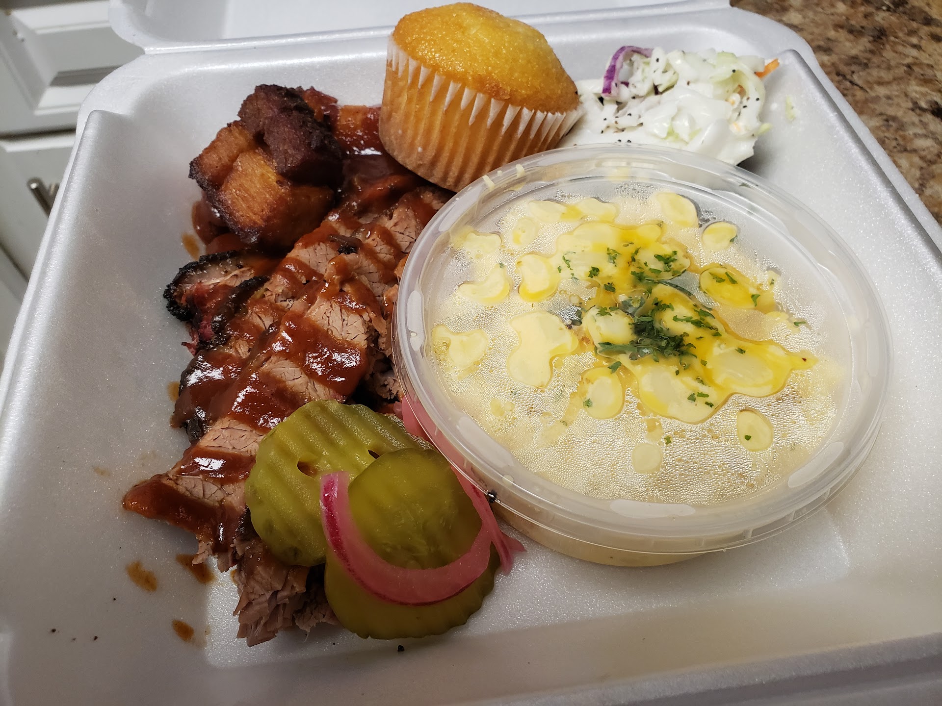 I want to say the food tastes decent (once reheated). Could have been better. Tasted like the ribs hadn't been deeply smoked. Mac & cheese was not great, no real flavor to it. Coleslaw, brisket, and spicy sausage were good. Husband enjoyed the sweetness of the cornbread.