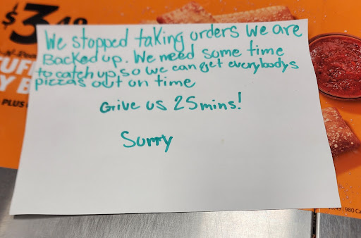 Why have a Pizza Portal if you're not going to use it? Front end person wasn't even in the store when I arrived and the poor person in back was washing dishes and just looked like they were ready to go home. "Crazy" bread with an emphasis on the crazy, half the pieces were just large dough nuggets and the rest were strips of flatbread with barely any butter/parm topping. Some one needs to QC the dough because nothing was consistent across our pizzas, they looked under proofed but also old. Topping placement was all over the board. A good third of one pizza had no cheese, and the slices ranged from 2 to 6 inches across the top (miscut). The second pizza was under sauced with a 3 inch crust line on one side and the dough itself looked like only one side proofed at all. I thought I believed in giving places second chances but I really don't see us ever...