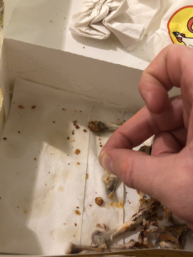 After a couple of minutes I watched the very nice employee put 2 thighs in a box on the prep bar and left to go to the side where the fries were but my actual view was obstructed and I couldn't see what she was doing. I figured she was getting fries.