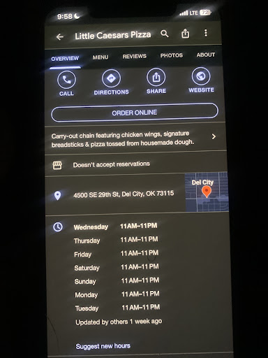 Read moreCall 12 times in 10 minutes no answer so I just drove there called when I was walking in and they just ignored the phone. So I ordered then called several more times while waiting and they still ignore the phone dispite the fact that there where not busy at all couple people in the drive through and I was the only one in the store at the time. A couple of costumers came in behind me and also seemed very unhappy with their service because apparently they had already been when waiting !!!! could here one of the employees in the back telling stories and cursing up a storm dispite the fact that there was now 4 people waiting in the store. Could see another employee on his phone dispite the fact that there was someone standing at the counter. NONE of the employees where wearing gloves or masks dispite the fact that we are in the middle of a pandemic, when I did get my food it was doughy and under cooked this was Sunday evening at 8:45 pm January 30th 2022. I am extremely disappointed in this particular little ceasers everyone working that shift so be fired I will be contacting corporate office and public health services. Worst little ceasers...