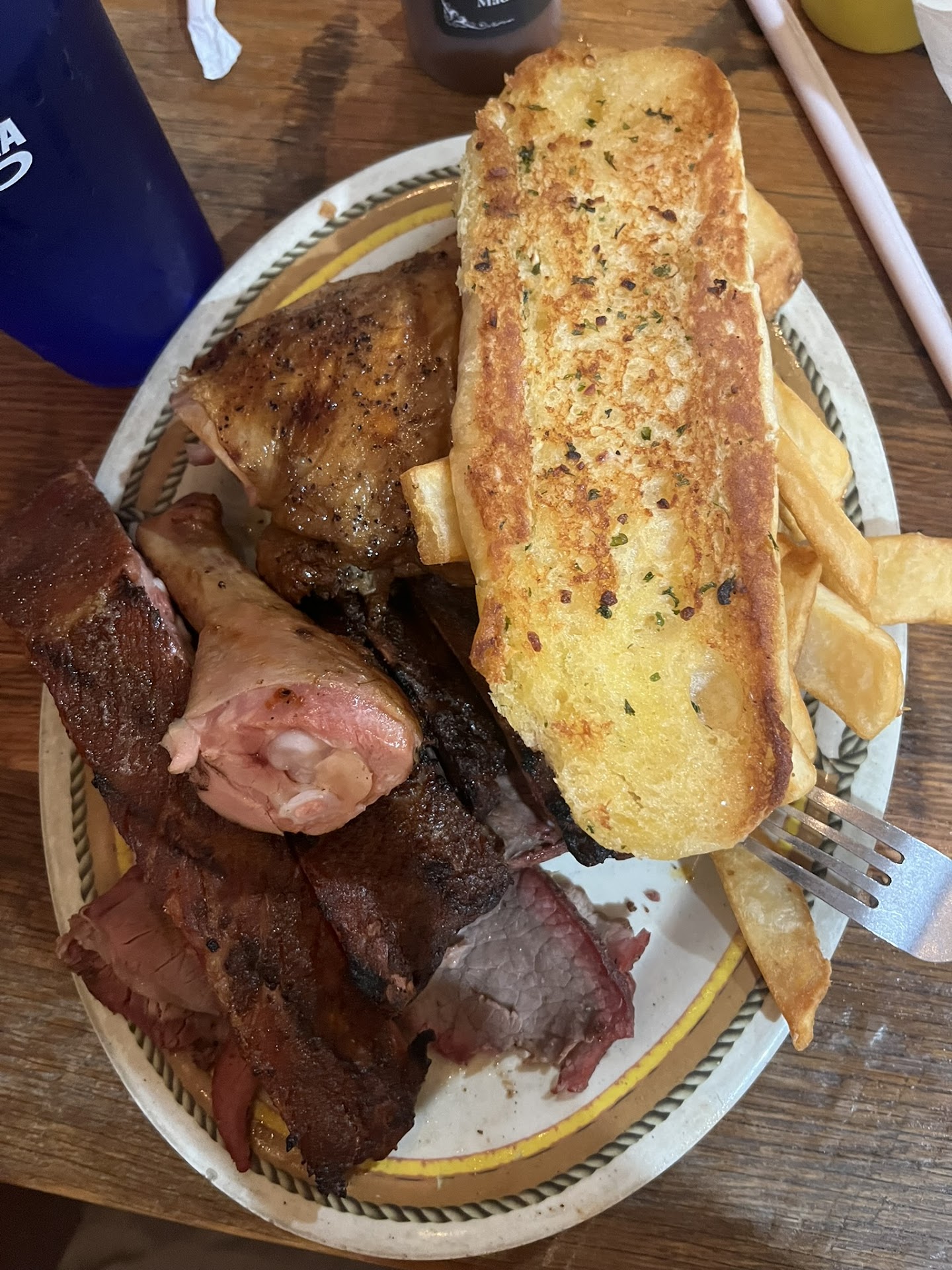 Read moreFool me once is all it takes. Many cars in the parking lot got me wondering so tonight I wondered no more. Very warm welcome from 4 staff members but that seemed to be fake. I was told to wait for the hostess and when she finally came back from seating someone, another group came in and was quickly seated ahead of us. The staff that greeted us never spoke up to correct this mistake but lucky for us it wasn’t busy so we were seated immediately afterwards. I had the combo plate which was a fair price for the amount of food, see picture. However, the plate couldn’t hold the portions so I asked for another plate. A bad idea because the table couldn’t hold all the plates, leaving no room what’s so ever to enjoy ones meal. The 6 bbq sauces were nothing to write home about, which left me unable to slobber the sauce of choice all over the meaty portions so I managed to eat without. I had chicken, ribs and sirloin. What showed up was a nice smoky flavored meat with lots of fat and very dry not the fall off the bone meat. The sirloin was cut like an Arbys roast beef, which I didn’t expect. And I did not touch the chicken, too disgusted to continue eating. The beans and corn were tasty but the fries were very cold and soggy. My wife had the shrimp linguine, which she said had no taste but it did have 15 nice size shrimp. My motto is try everything once so you have your own opinion thus I did at Brian’s BBQ and that will be the last. I lived in San Antonio Texas for 9 years and I gotta say Brian’s BBQ is not Texas...