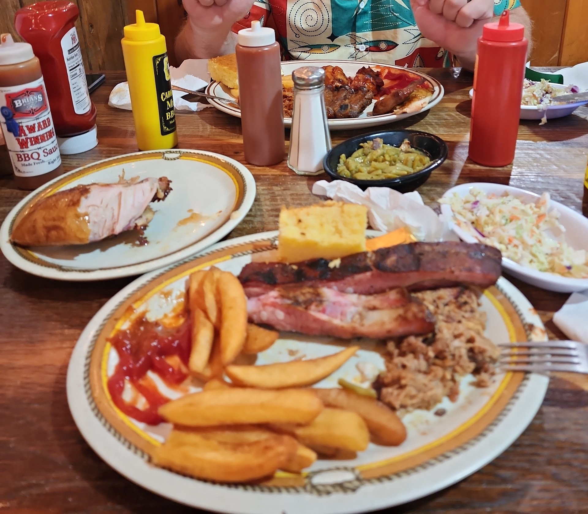 Read moreFool me once is all it takes. Many cars in the parking lot got me wondering so tonight I wondered no more. Very warm welcome from 4 staff members but that seemed to be fake. I was told to wait for the hostess and when she finally came back from seating someone, another group came in and was quickly seated ahead of us. The staff that greeted us never spoke up to correct this mistake but lucky for us it wasn’t busy so we were seated immediately afterwards. I had the combo plate which was a fair price for the amount of food, see picture. However, the plate couldn’t hold the portions so I asked for another plate. A bad idea because the table couldn’t hold all the plates, leaving no room what’s so ever to enjoy ones meal. The 6 bbq sauces were nothing to write home about, which left me unable to slobber the sauce of choice all over the meaty portions so I managed to eat without. I had chicken, ribs and sirloin. What showed up was a nice smoky flavored meat with lots of fat and very dry not the fall off the bone meat. The sirloin was cut like an Arbys roast beef, which I didn’t expect. And I did not touch the chicken, too disgusted to continue eating. The beans and corn were tasty but the fries were very cold and soggy. My wife had the shrimp linguine, which she said had no taste but it did have 15 nice size shrimp. My motto is try everything once so you have your own opinion thus I did at Brian’s BBQ and that will be the last. I lived in San Antonio Texas for 9 years and I gotta say Brian’s BBQ is not Texas...