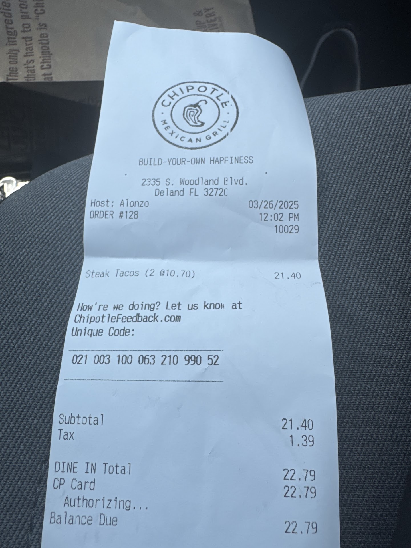Read moreto go out to get something to eat even through a fast food place is something I really can't afford to do I'm not feeling well today I was just on my way home I decided to try the new Chipotle here in Orange City on Woodland Boulevard the rap music was so loud I had to ask three times what the guy behind the counter was saying the food was horrible it was cold as soon as I got home and tried to eat that thing called a burrito and I only live two miles away so it wasn't like you know it had a chance to get cold by the way. I mean it was ice coldas soon as I took it out of the wrapper it completely fell apart it was nothing but a thing of mush the wrap was all soggy and gooey and fell apart that burrito was $10 the $10 I could had a beautiful meal at Chick-fil-A if it was open Chick-fil-A is not open on Sunday that's why I went to Chipotle I will never go again Plus I'm having a lot of nerve damage in my leg it hurts a lot I work 18-hour days a lot of times I lost a little control of my leg and it wiggled and jiggled it almost fell out from under me and I don't know if the kids were laughing at me but right after I did that there was hysterical laughing I never look back to see or say anything I just wanted out of there I was in pain. I will never ever go back there again expensive and horrible I very very rarely ever give a complaint I don't want to see somebody's business get hurt but corporate people from this establishment if this is how you run stuff you don't deserve to have your jobs it is not managers is comes from corporate and you suck you do not train your people correctly and probably do not pay enough for any one to care. I am sorry I spent my too hard earned ten...