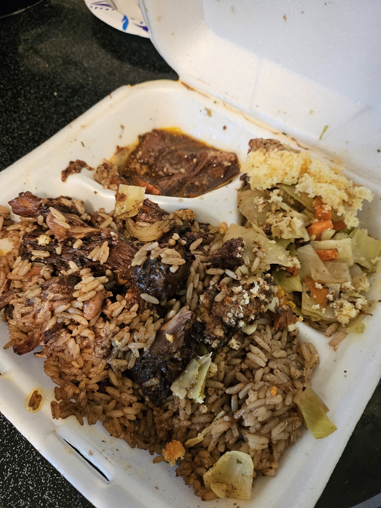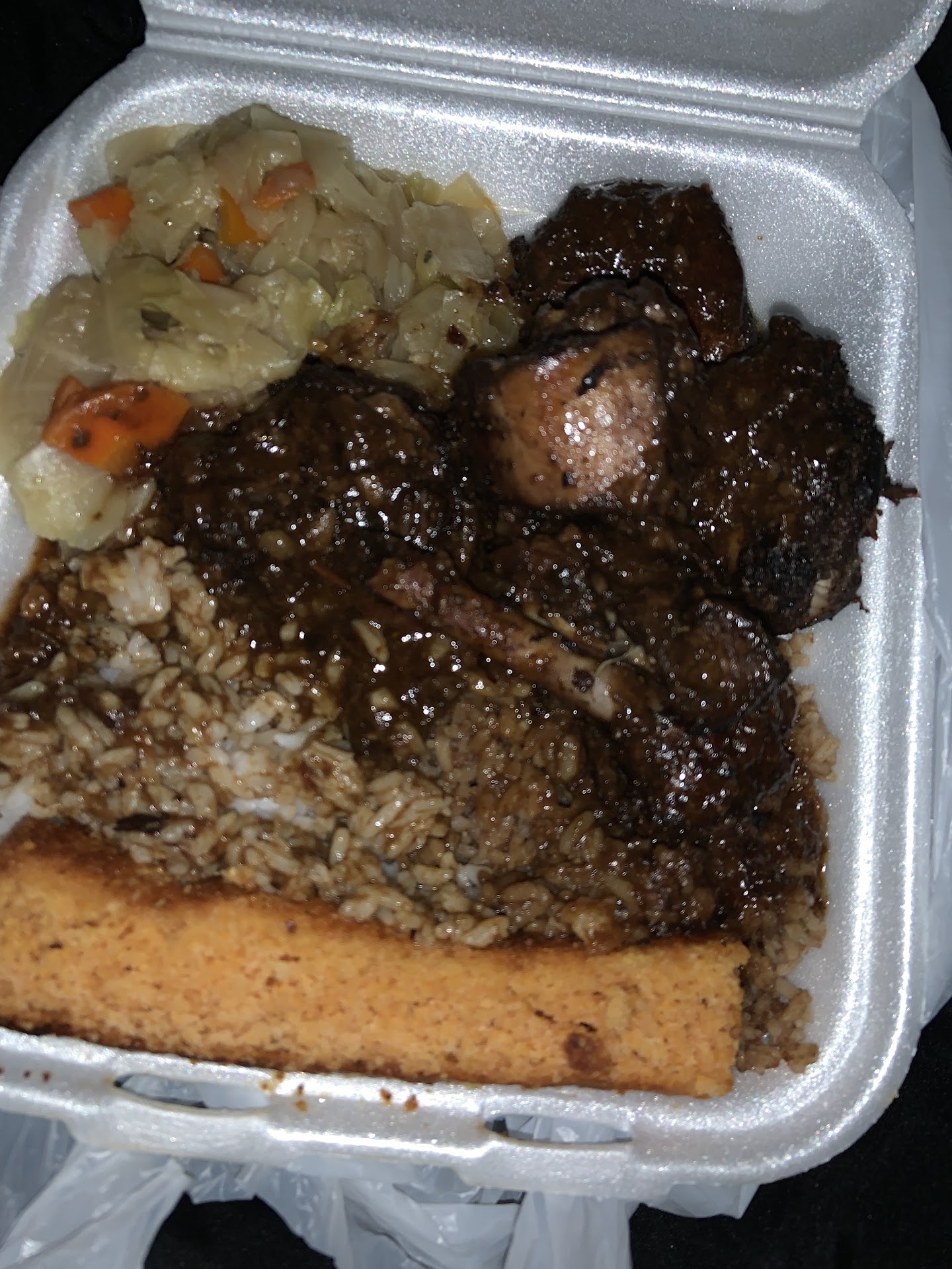 All I can say is get there as early as you can before all the food is gone. We arrived there on a Wednesday night @6pm since they closed at 8pm but unfortunately what was left was a little bit of oxtails and curry goat. Since my taste buds was wanting some authentic cuisine we decided to get what was left so we went with the oxtails, cabbage, cornbread and a little rice.