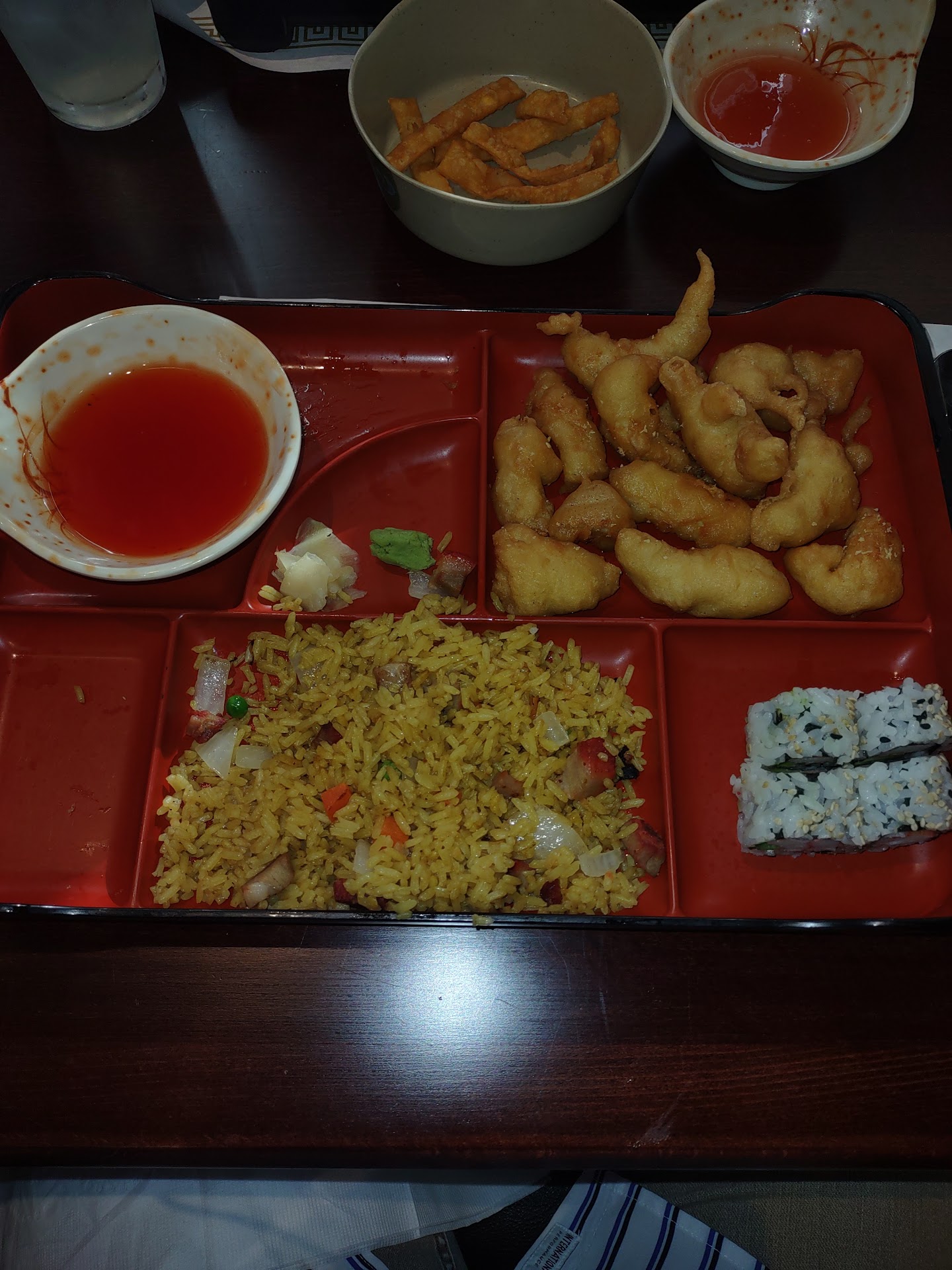 Read moreWe received a flyer in the mail and it featured all day bento boxes. At only $13.99 we figured we'd give it a try. Boy were we pleasantly surprised. Sitting in what looks to be a new-ish shopping center, the outside is pretty non-descript. But once you enter, you are greeted by a visual delight. A dark ceiling illuminated by a purple/blue neon like strip of light hugging the exterior walls. A divider of clear cylinders full of water animated by a torrent of bubbles, it's visually fun and calming all at the same time. We were greeted and seated immediately. They have an extensive menu from sushi to Thai dishes, but we were there for the bento boxes. Our server greeted us with a smile and took our order. We opted for 1) Mongolian beef with fried rice, salad and an egg roll. It also came with a California roll. 2) Sweet and sour chicken with fried rice, wonton soup, spring roll and a California roll. We opted for lemonade and club soda but they have wine and beer and other soft drink options. Portions were good. Food was hot and tasty. We will be back. Place seemed very popular as it was filling up and there were folks waiting...