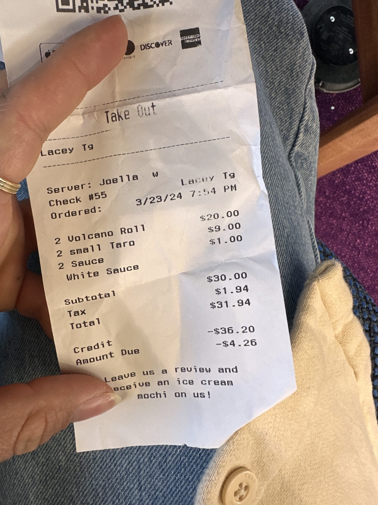We called ahead to check on wait at 7:45pm was informed that there was no wait but the person on the phone made sure to tell me they close at 9pm. We walked through the door at 7:50pm. "Sit where ever you want", most tables were dirty or occupied, two tables were available on one said reserved. We sat at the reserved table. We waited about 10 minutes before we got water and the waitress said someone will be with us in a minute. Another 10 minutes go by the same waitress comes back and mutters "Are you guys ready?". We all order, I ordered sake, miso soup/ginger salad and two rolls. Soup/salad come at an appropriate time like 5-10 minutes. However, still no sake. I asked "Is the sake on the way?" She replied sure thing. Sake arrives warm, obviously forgotten in the microwave. Food arrives just as we are finishing the salads and soup. The food is auctioned off, there are four of us at the table and the person dropping off the food is the one that took the order. How do you not know where the food is going? Salad and soup dishes stay on the table even though we are obviously through with them. No offer for more sake. We finish with the food around 8:45. We ask for a split check. The waitress sets both checks on the other side of the table so we have to pass the checks around. I put my card in my check book and set it on the table with the card sticking out. The waitress comes by and the other party hands her the check, the waitress looks at the other check and then around the tables and states, "only one?". She knew the check was there and ready she just didn't want to walk around and pick it up. When she returned and she dropped the checks off on the one side of the table in a stack and did not hand them back out. As soon as the checks were dropped off the waitress dissapeared. There were no pens to sign the check. We kinda shouted to the back to ask for a pen but no reply. I got up and went to the host stand and grabbed some pens. The biggest kicker for this entire experience is that I did not have a napkin for the entire meal and that all the dishes(soup bowl, app plate, salad bowl, and sushi plates)stayed on the table for the entire experience and the waitress had a bad attitude the whole time. She clearly did not want us there. I have had better service at Waffle House.