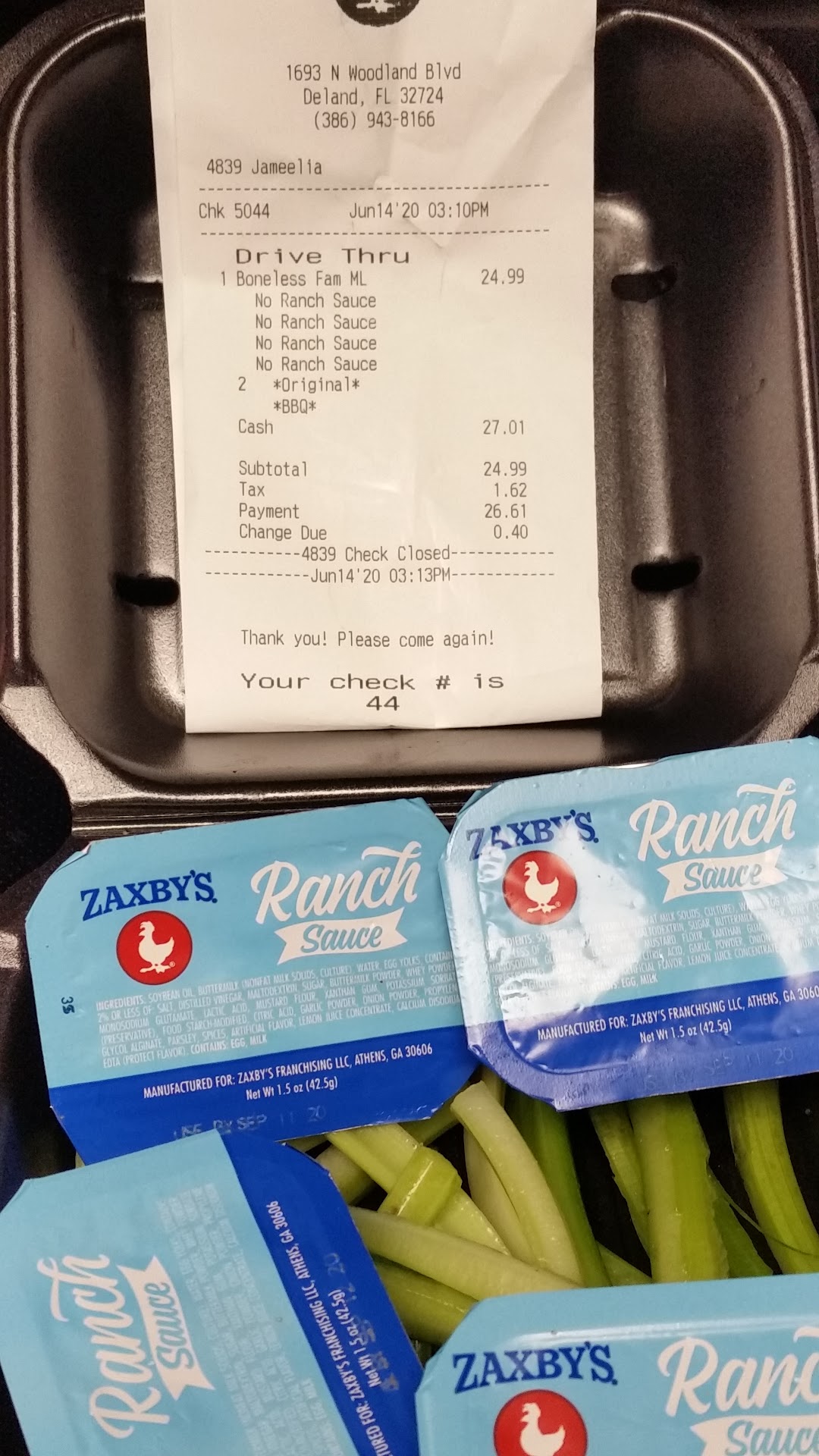 Read moreI went to Zaxbyâs today (May 5th) and order chicken fingers with extra fries. I also ordered an extra container of seasoned salt because I love it on my chicken as well. A nice young man behind the counter rang it up and I paid.