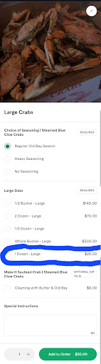 I went into the store to pickup a crab order and was given a flyer with 10% off if I ordered online. Once I got back home I went to place an online order but found the prices to be falsely advertised. On the website it lists 1 dz crabs for $28 however when going to order those the prices jump to 66.00. when I called the store to clarify, and was told that the price listed is for half a dozen, not one dz as advertised. I don't know how the crabs taste because I ended up not placing an order bc of the confusion, but the store really needs to fix that because it is confusing and misleading. Maybe I will try at a later time.