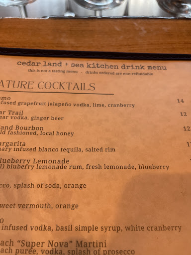 Read moreWe ate at Cedar tonight which had been one of our favorite restaurants until now. Unfortunately it was due to the hostess - not the food or waitress - and we do not intend to go back. We arrived at 5:05 pm the restaurant a little early for a 5:15 pm reservation with my elderly parents. There was one table seated and others sitting at the bar which was full. The hostess told us that we would have to wait to be seated for about 10 minutes because she had 5:00 reservations she would need to seat when they arrived. I am not sure why she was unable to seat us at that time and what difference it made - the people who had the 5:00 pm reservation were not even there yet. 2 more groups came in - both with 5:15 pm reservations - and she told them the same thing. We all stood crowding the front entrance area while we all waited for her 5:00 pm reservations to arrive. We were finally seated at 5:15 pm and the other 2 groups were seated right after. Now there were 4 tables seated and the people with the 5:00 reservation were still not there. She was not friendly, quite rude, and continued to tell people coming in the same thing - again making no sense.