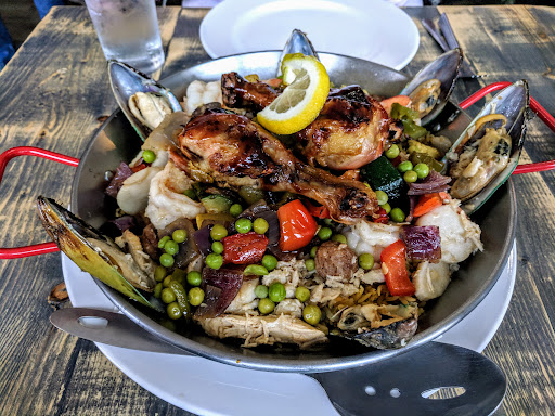 For our main course, my dad and I shared the Paella. Served in a hot skillet, it was stacked high with seafood and meats—shrimp, scallops, mussels, crab, chicken, and chorizo. The saffron rice soaked up all the delicious juices, while the chorizo added a pleasant smoky note. We loved the lively mix of flavors and textures, and it was a generously sized dish.