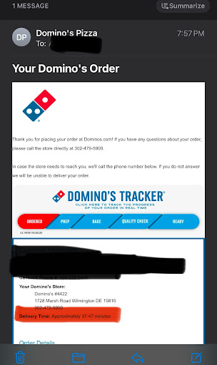 Ā Ā Ā Read moreWe ordered food 10 mins before we got home, in hopes it would arrive in time for us to get settled. We waited 45 mins at home. 2 medium, 1 topping pizzas and paramesan garlic bites. When the boy got here, his lackadaisical attitude about him forgetting the receipt and our paramesan bites were frustrating. His solution since "our food was already here." was to have the store remove the bites from our order. I said that our food wasn't all here and I ordered specifically from Dominos to get the bread bites. I've had delivery boys forgot things from multiple places, always apologetic and I would always say it was no big deal. This boy's lack of customer service and consideration was the worst.